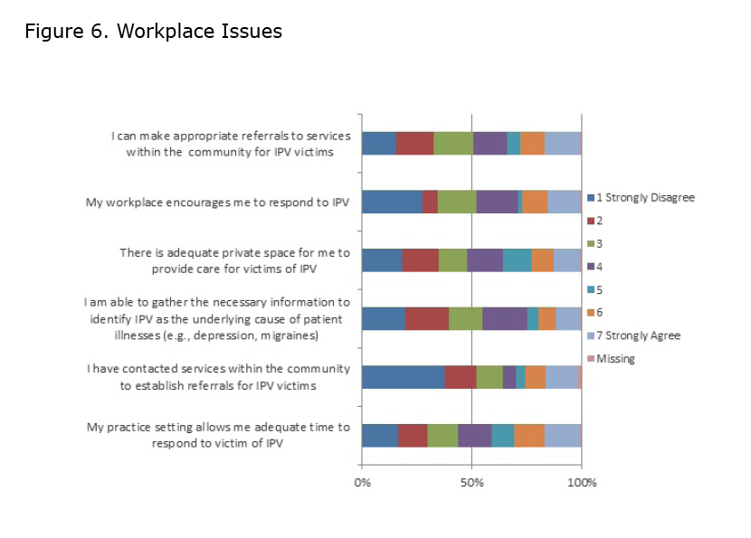 Workplace Issues. Approximately 50% of respondents strongly disagreed, disagreed, or somewhat disagreed with all but two items related to workplace issues (Figure 6). The responses were evenly divided between agreed and disagreed with the statement: my practice setting allows me adequate time to respond to victims of IPV. Fifty percent disagreed with the item: I can make appropriate referrals to services within the community for IPV victims, and another 64% disagreed with the statement: I have contacted services within the community to establish referrals for IPV victims.