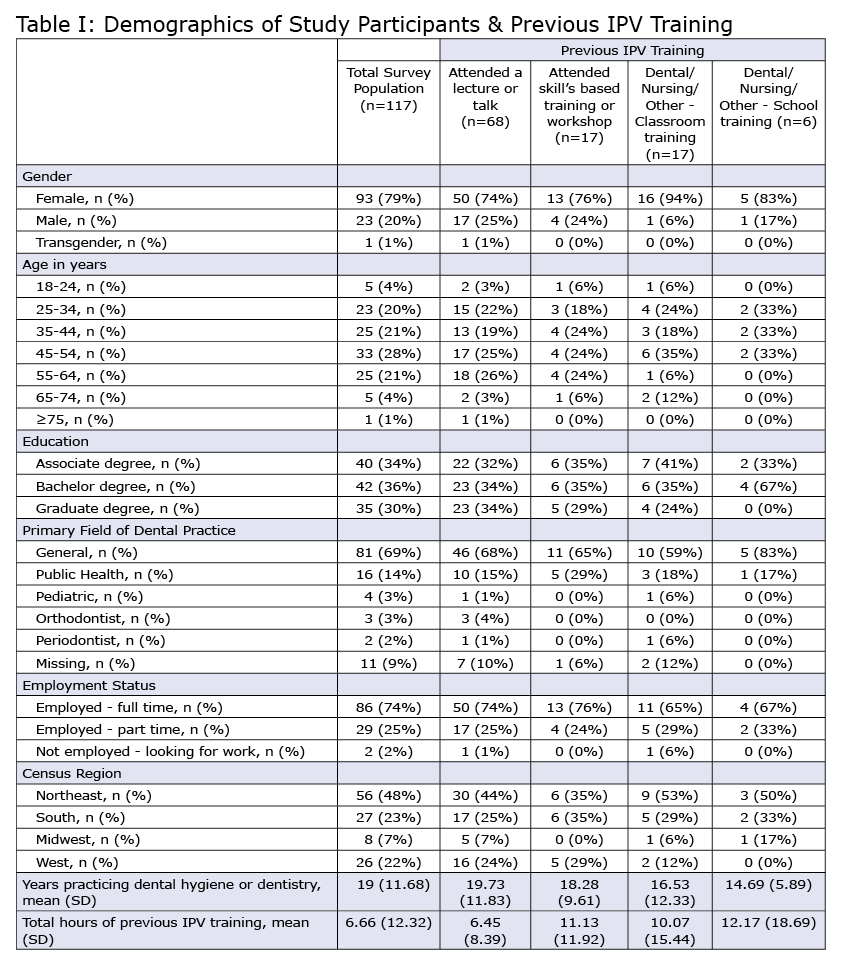 One hundred thirty-three participants met the study inclusion criteria and were given and submitted the survey. To account for large amounts of unanswered questions by participants, responses for participants who left one or more of the five major sections in the survey instrument entirely unanswered were excluded from the analysis. Following this exclusion for missing data, a total of 117 participants were included in the analysis. The participants were primarily 25 to 64 years of age, and predominately female (79%) with 20% male and 1% transgender (Table 1). The most common specialties in the primary field of dental practice included general dentistry (69%), periodontal practice (2%), public health (14%), pediatric (3%), and orthodontics (3%). The respondents had a mean of 19 years in practice.