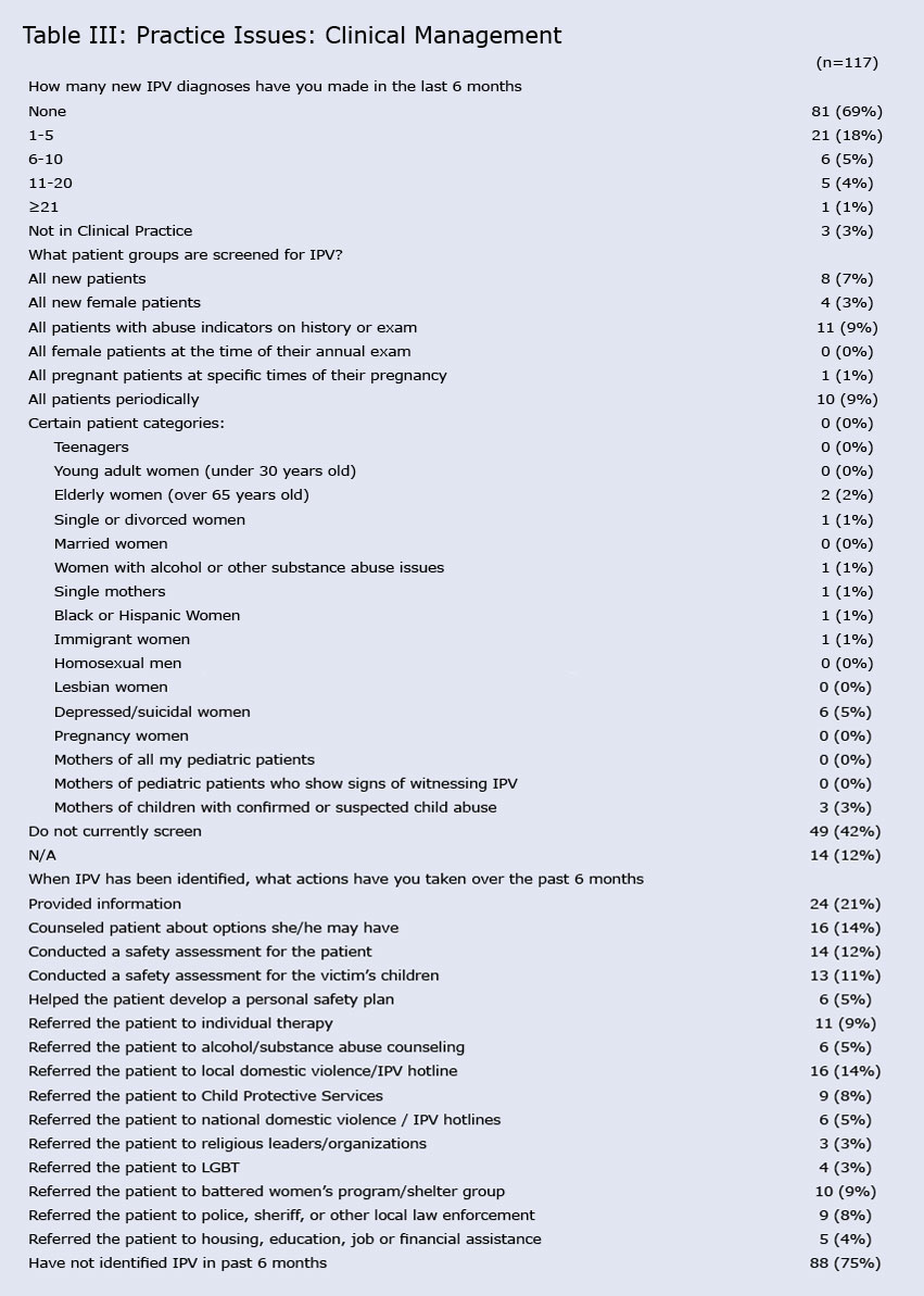 Clinical Management. A majority of respondents (89%) reported not identifying IPV in the last 6 months, but only 7% screen all new patients, and 9% screen patients when abuse indictors on history or exam are noted (Table 3). When IPV had been identified, 14% reported referring the patient to a local domestic violence/IPV hotline, and 21% provided information to the patient.