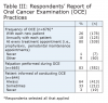 Oral cancer lesions are usually detected in the Oral Cancer Examination (OCE); Cotter et al found a significant positive correlation between the identification of a suspicious lesion and the performance of oral cancer screening.12 Visual examination and lymph node palpation are reported to be valued components of the OCE, yet are not always performed. The majority of our respondents reported conducting some type of palpation, with the lymph nodes and tongue reported to be the least commonly examined by palpation. According to Kujan et al, many dental hygienists are seriously misinformed of what constitutes a thorough examination.2