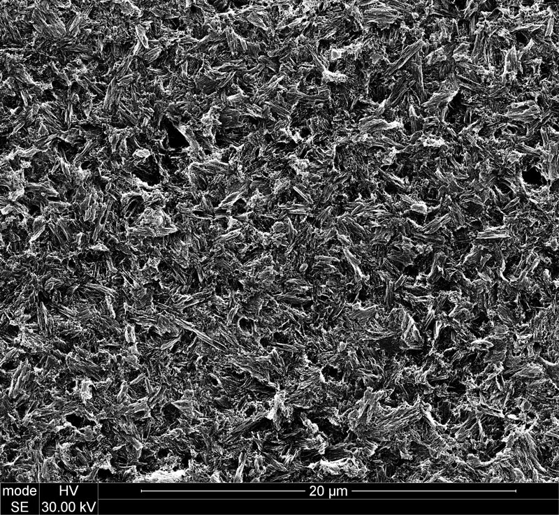 For glass-based restorations, surface roughening is created by etching the ceramic with hydrofluoric acid (Figure 1). Hydrofluoric acid selectively dissolves glass and leaves behind a fine texture of crystals that will interlock with the resin cement (Figure 2). Hydrofluoric acid is a stronger acid than the phosphoric acid used to etch tooth structure and should be kept off of skin or gingival tissue. It can be supplied in 5% or 9.5% concentrations. Etching time will be dependent on the type of ceramic material—lithium disilicate requires 20 seconds of etching with 5% hydrofluoric acid, whereas porcelain requires 1 to 2 minutes of etching with 5% hydrofluoric acid. Most dental laboratories will etch lithium-disilicate and porcelain restorations prior to mailing them back to the dentist. It is important to communicate with the laboratory to ensure that the crowns are being etched.