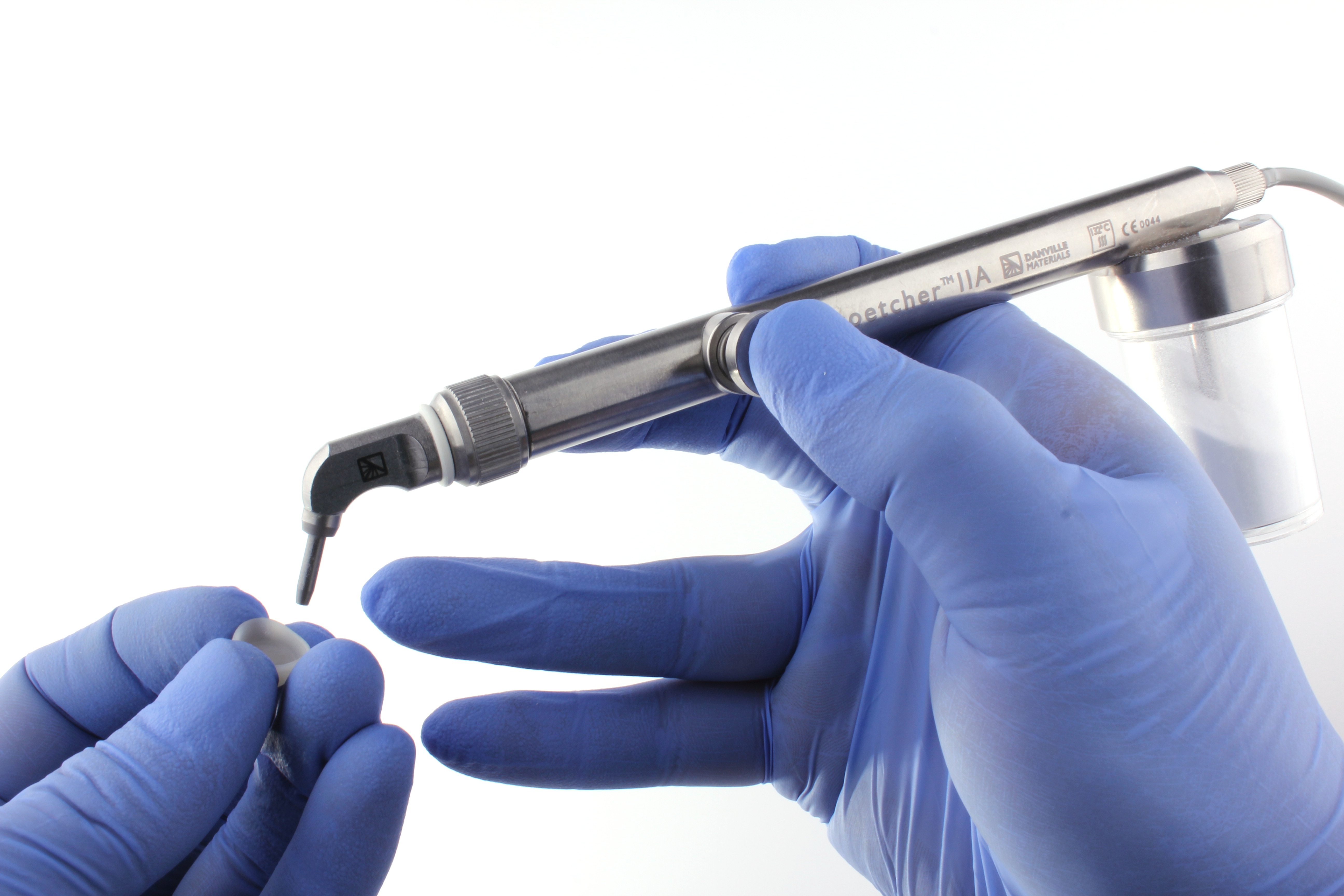 Sandblasting zirconia restorations should be accomplished with 50-µm alumina for 10 seconds at a distance of 10 mm at somewhere between 30 psi to 60 psi of pressure (Figure 3). This procedure will produce surface texture for bonding (Figure 4). Most sandblasting units contain either alumina particles, glass beads, or separate containers for both. Glass beads are less dense than alumina and are much less abrasive. When preparing traditional zirconia, it is necessary to sandblast with alumina particles because glass beads do not create surface texture for bonding. Due to the high strength and toughness of zirconia, sandblasting with alumina does not reduce its strength.5 Newer “translucent” or “cubic” zirconia lacks the transfomation-toughening properties of traditional zirconia and should only be sandblasted with alumina if the crowns will be bonded with a resin cement, not if they are cemented with a RMGI cement. Glass-based ceramics, however, should never be sandblasted with alumina because it will significantly weaken them.6 If the clinician desires to clean glass-based ceramics by sandblasting, glass beads should be used.