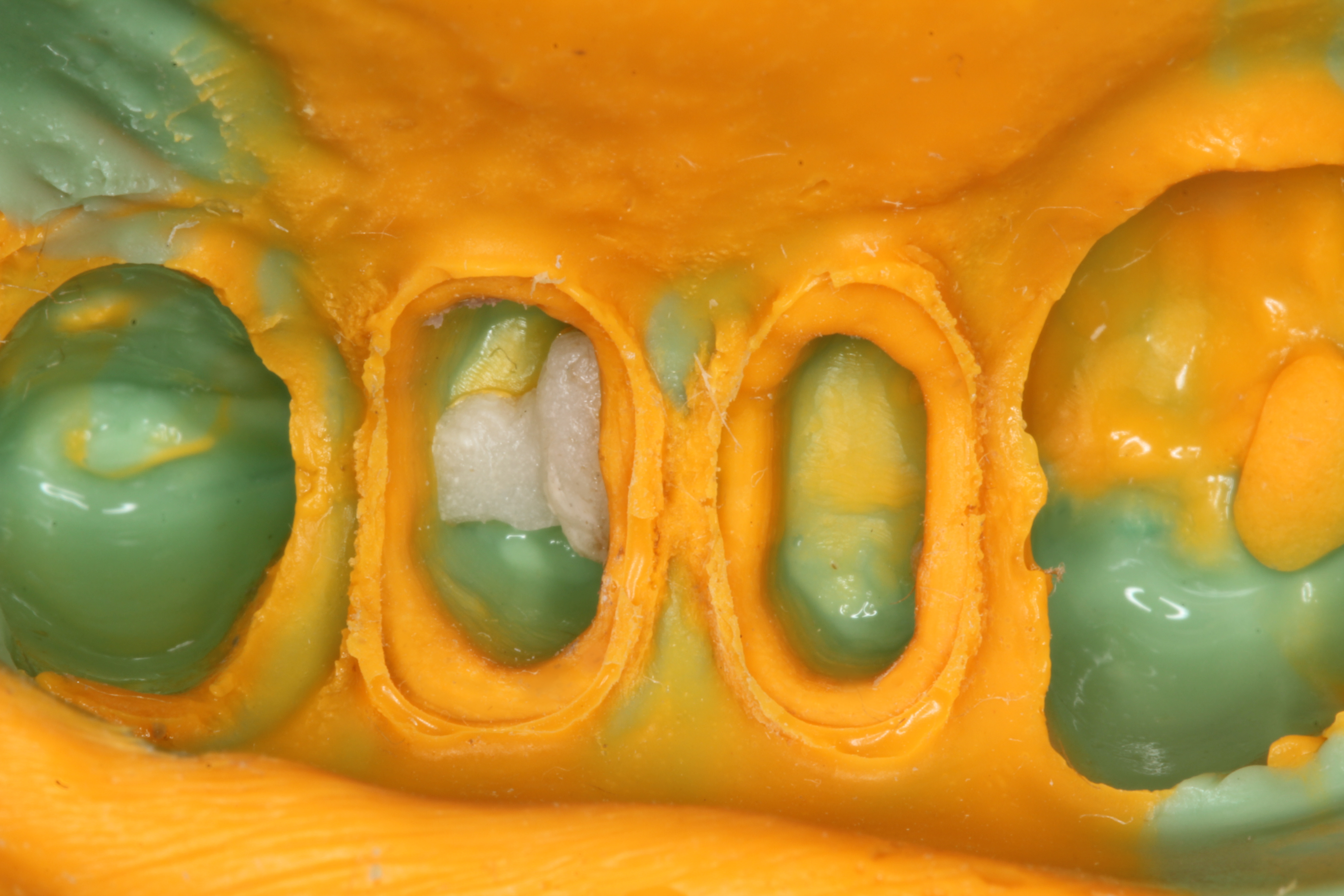 Resin cements may also be classified as dual-cure or light-cure only. The advantage of a dual-cure cement is obvious; the cement will chemically cure even if adequate light polymerization is not achieved. This type of cement is particularly advantageous for zirconia crowns because they are too opaque to allow much light to pass through the crown. The advantages of light-cure cements are that they allow the clinician longer working time and they have historically been more color stable than dual-cure cements. The issue with color stability of dual-cure cements is related to an amine-based chemistry, which allows the cement to chemically cure. Recently, amine-free dual-cure cements have been developed to avoid the possibility of color change of the cement.12 Another issue related to dual-cure materials is that the use of an acidic self-etch adhesive on the tooth prior to application of an amine-containing dual-cure cement or build-up material may interfere with the setting reaction of the cement. To avoid this problem, a dual-cure activator can be mixed with the self-etch adhesive, or an amine-free cement can be used. Figure 5 shows a build-up that debonded while taking a final impression. The amine-containing build-up material was placed over an acidic self-etch adhesive.