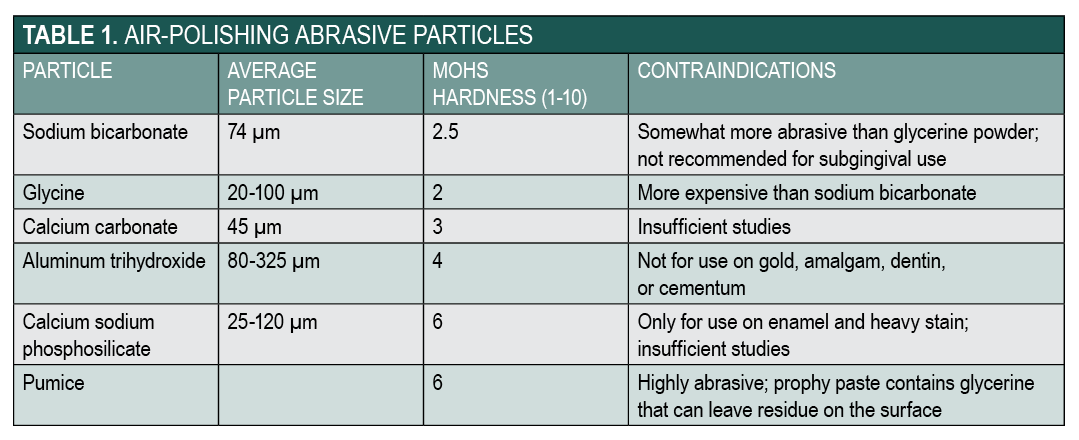 The powder is combined with a flavoring agent and small amounts of calcium phosphate and silica to facilitate a free flow within the device. The average sodium bicarbonate particle size is 74 µm, and its hardness is 2.5 on the Mohs scale, which ranges from 1 to 10. Comparatively, pumice, the standard particle used in prophylaxis paste, has a Mohs hardness number of 6,11 and air abrasion with aluminum oxide is about four times more abrasive than air polishing with sodium bicarbonate (Table 2).8,9