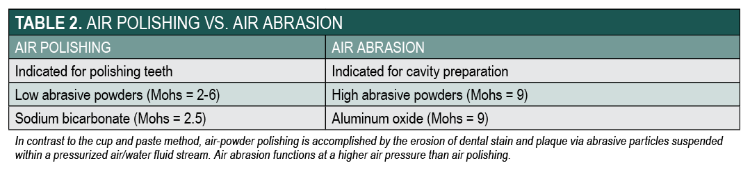 Evolving from technology originally developed in 1945 by Dr. Robert Black,5,6 standard air-polishing devices, also known as air-powder polishing devices, propel a pressurized air/water fluid stream containing abrasive particles by kinetic energy through a handpiece nozzle against the tooth surface, thereby removing dental plaque and stain.7 Air polishing is intended for dental plaque and stain removal only, not the removal of hard deposits; air abrasion is used for the removal of decayed enamel and roughening dental material surfaces before bonding.7-9