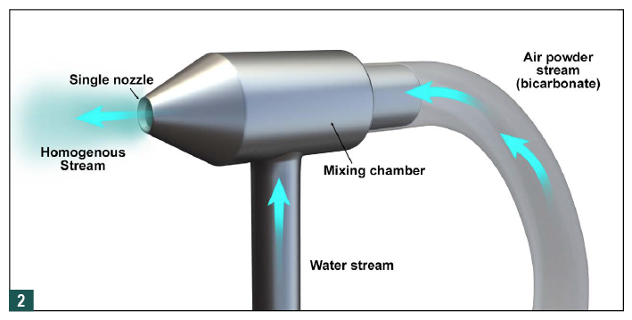 The delivery arrangement of standard air-polishing devices with two concentric tubes can lead to frequent blockages, because a hard, crystalline deposit of abrasive anhydrous sodium bicarbonate can accumulate in the lumen of the air tube.21 The device then cannot function, resulting in clinical downtime while the nozzle is either replaced or cleaned. Additionally, and perhaps most importantly, standard air-polishing devices bombard surfaces (eg, tooth or implant) with potentially damaging abrasive particles, because no mixing with water occurs until the particles and water hit the surface.