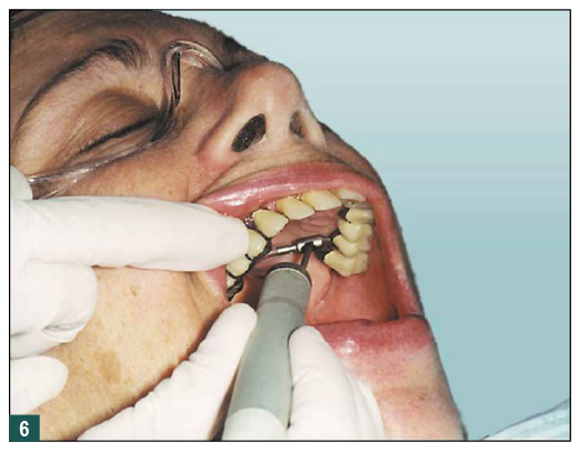 As a result, innovative air-polishing devices utilizing HST or glycine powder can be used routinely for implant maintenance, biofilm removal around implants (Figure 3 and Figure 4), and cleaning around implant abutments (Figure 5), attachments, and superstructures (Figure 6 and Figure 7) without concern about damaging the implant (eg, titanium implants) or transmucosal element surfaces. In fact, an HST polishing system and a glycine powder air-polishing system were shown to cause no damage to titanium implant surfaces during cleaning.23