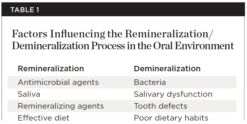 Dental caries are a pathological condition that results from an imbalance in the physiological process of remineralization/demineralization of the dental structure.1 Remineralization plays an important role by preventing the progression of the disease and reversing initial signs of demineralization (Table 1).2-4 If the demineralization process continues, cavitation will eventually result. Because of the presence of calcium and phosphate ions in a supersaturated state, human saliva has the potential to remineralize tooth structure.1 Caries can be arrested or even reversed at the pre-cavitated stage, provided a balance towards remineralization can be established.
