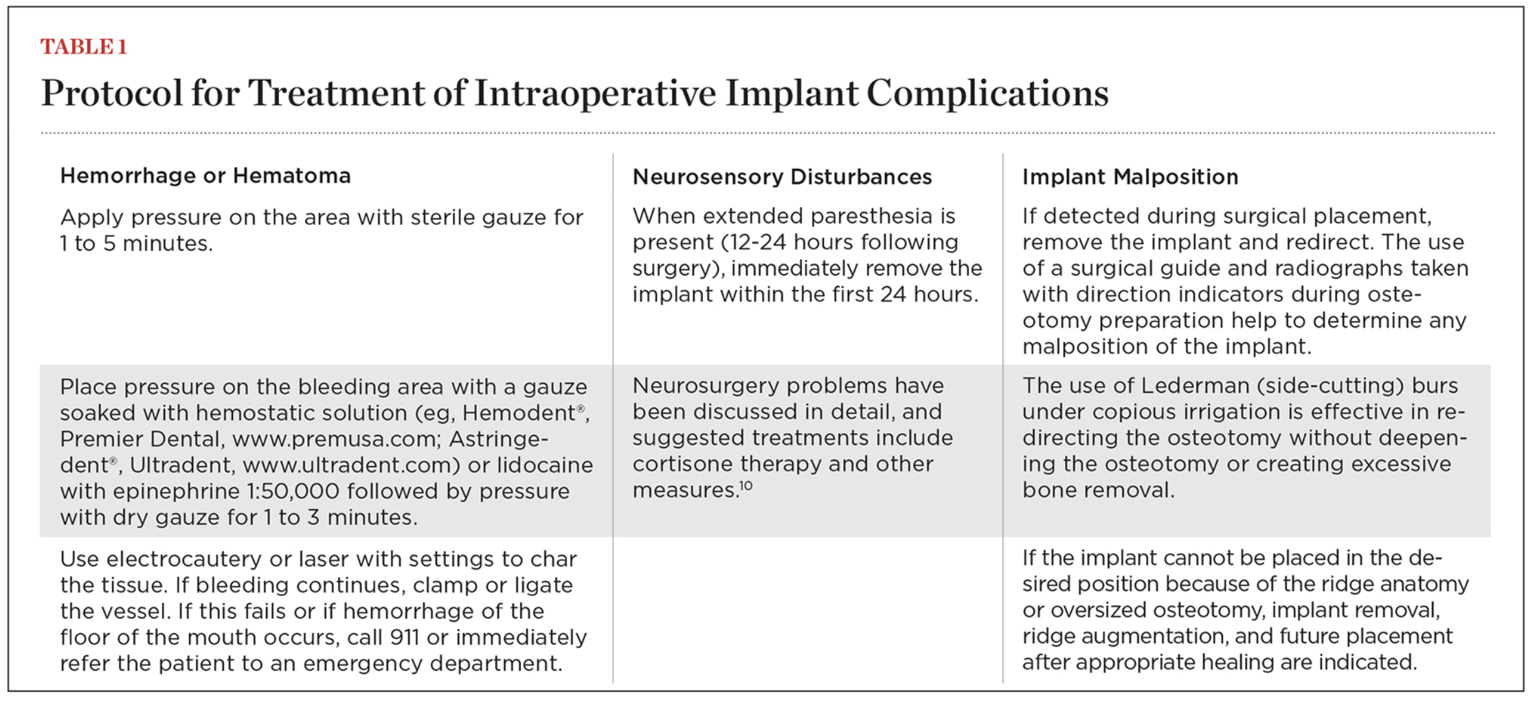 Suggested treatment for hemorrhage or hematoma, neurosensory disturbances, and implant malposition encountered during surgery is outlined in Table 1.10