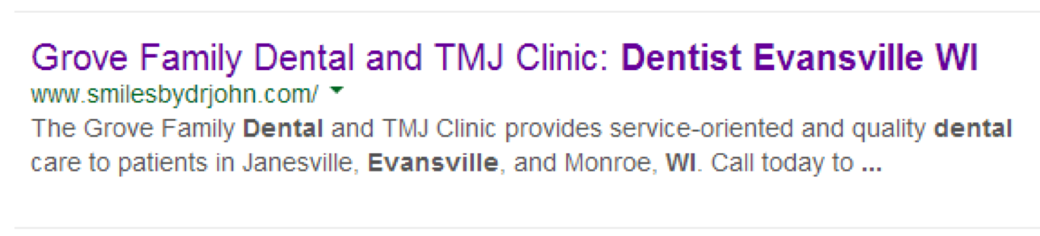 2. Meta-description. A meta-description provides a search engine with a description of the website, which the prospective patient then sees after the search results are listed (Figure 4). Prospective patients will use this information to learn more about the dental practice and make a split-second decision whether to click on the link leading to the website. As with title tagging, the responsibility of writing a meta-description falls on the website owner or the site marketing company employed by the practice, and a good meta-description should use keywords that define the practice, including specialties, location, and popular SEO terms such as “dental,” “dentist,” and “dentistry.”
