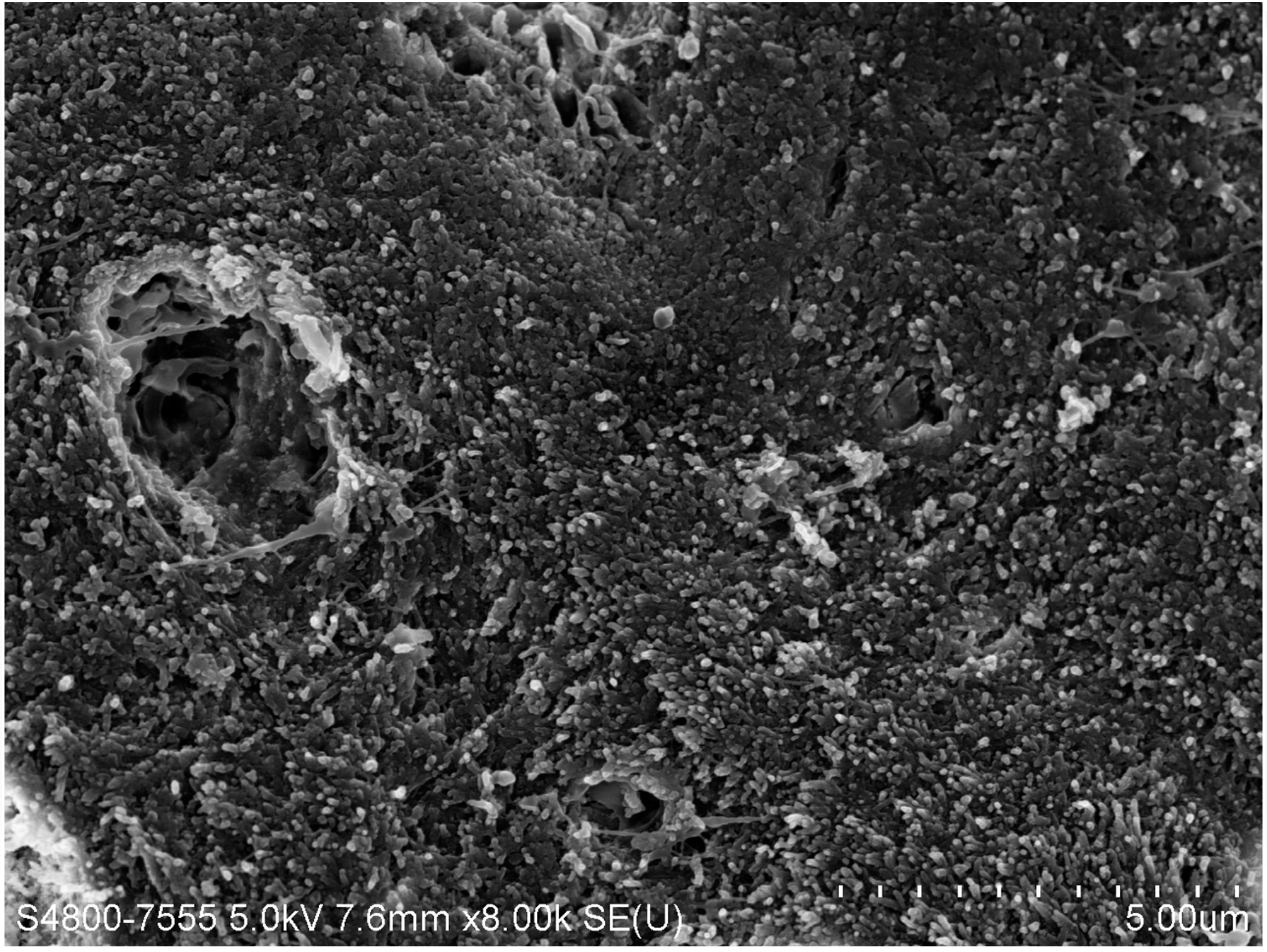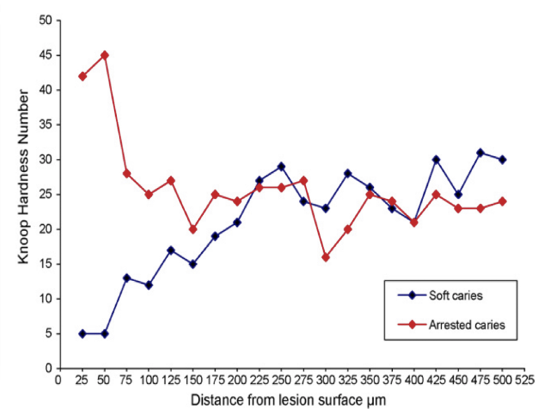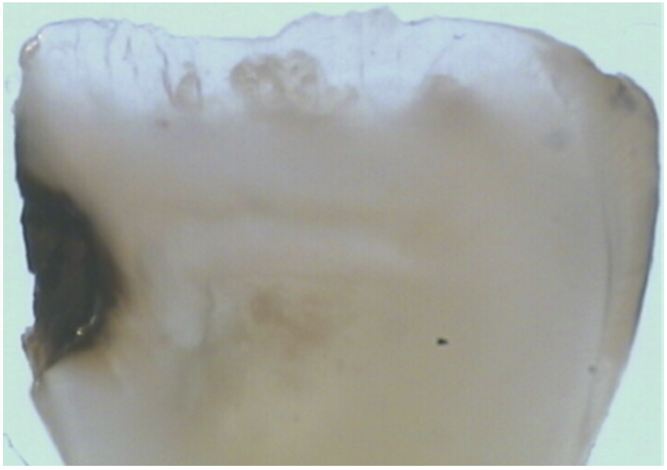 There are several advantages of using SDF in dental treatment. First, it showed an antimicrobial activity against mono-species, dual-species, and multi-species cariogenic biofilm.14-16 Silver ions are bactericidal metal cations that inhibit biofilm formation.17 Studies have indicated that silver interacts with sulfhydryl groups of proteins and DNA, thus altering hydrogen bonding and inhibiting respiratory processes, DNA unwinding, cell-wall synthesis, and cell division.18 At the macro level, these interactions affect bacterial killing and inhibit biofilm formation.17 Second, fluoride promotes caries lesion remineralization. Fluoride has been indicated to react with hydroxyapatite and generate calcium fluoride, which is a reservoir of fluoride, and facilitate further remineralization.19 An ex vivo study reported surface microhardness of the surface layer of the arrested caries after SDF applications was comparable with the unaffected sound dentin20 (Figure 1 and Figure 2). This is consistent with another study, in which a high remineralized zone was observed on the surface of arrested caries from exfoliated teeth with SDF treatment21 (Figure 3 and Figure 4). Third, its application procedures are simple and do not require injection or drilling, and the treatment does not involve expensive support infrastructure equipment such as piped water and electricity. The simplicity of the treatment is conducive to treating caries in apprehensive young children who may have intense dental fear, uncooperative patients with special needs, or elderly patients who have difficulty adapting to traditional dental care. It also allows trained workers to deliver the treatment to people who live in the area but who may not be able to easily access dental service.22 Patient compliance and satisfaction is often good when the patient is provided a clear explanation of the treatment outcome.23,24 Finally, the cost of SDF treatment is low and should be affordable in most communities.