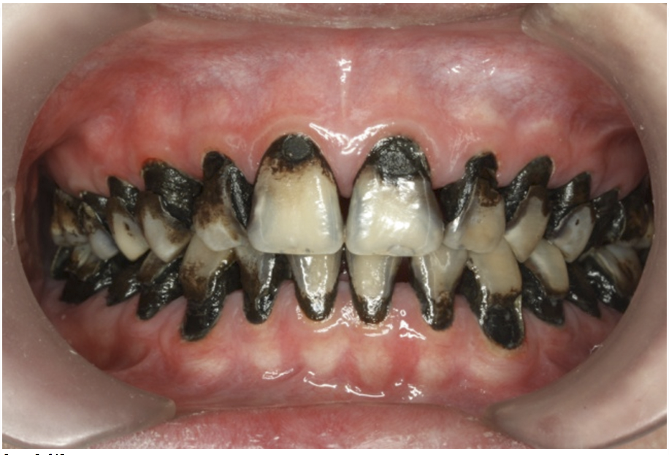 There is no consensus on the frequency of application, and 38% SDF has been used annually or biannually on clinical trials in children23,31,33,34 and in elderly.30,35 Yee and his co-worker found one-off application of 12% SDF was ineffective in arresting caries in children.31 The present authors applied 38% SDF weekly for 3 weeks to speed up the process of caries arrest and for treatment of rampant caries.36 One of the present authors’ case reports demonstrated that three weekly applications of 38% SDF can arrest rampant caries and relieve pain from hypersensitivity on a teenager. The SDF-treated caries were found arrested, and they turned coal black in appearance (Figure 9).