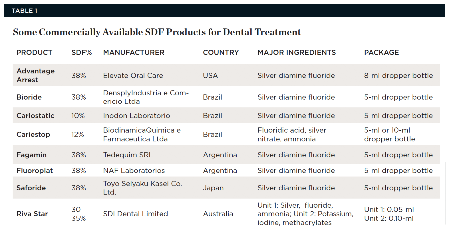 Two different chemical forms are available for silver and fluoride combination: silver fluoride and SDF. Silver fluoride at 40% was used in western Australia to arrest dental caries in children.12 SDF contains ammonia and silver fluoride; the ammonia ions combine with silver ions to produce a complex ion called the diamine-silver ion, and this complex is more stable than silver fluoride. Thus, it is also called diamine silver fluoride. SDF is claimed to be more stable than silver fluoride, and it can be kept in constant concentration for a period of time.13 While silver fluoride is becoming less readily available in dentistry, SDF is commonly used in 38% solution for treatment of hypersensitivity and caries control. Some commercially available SDF products are listed in Table 1.