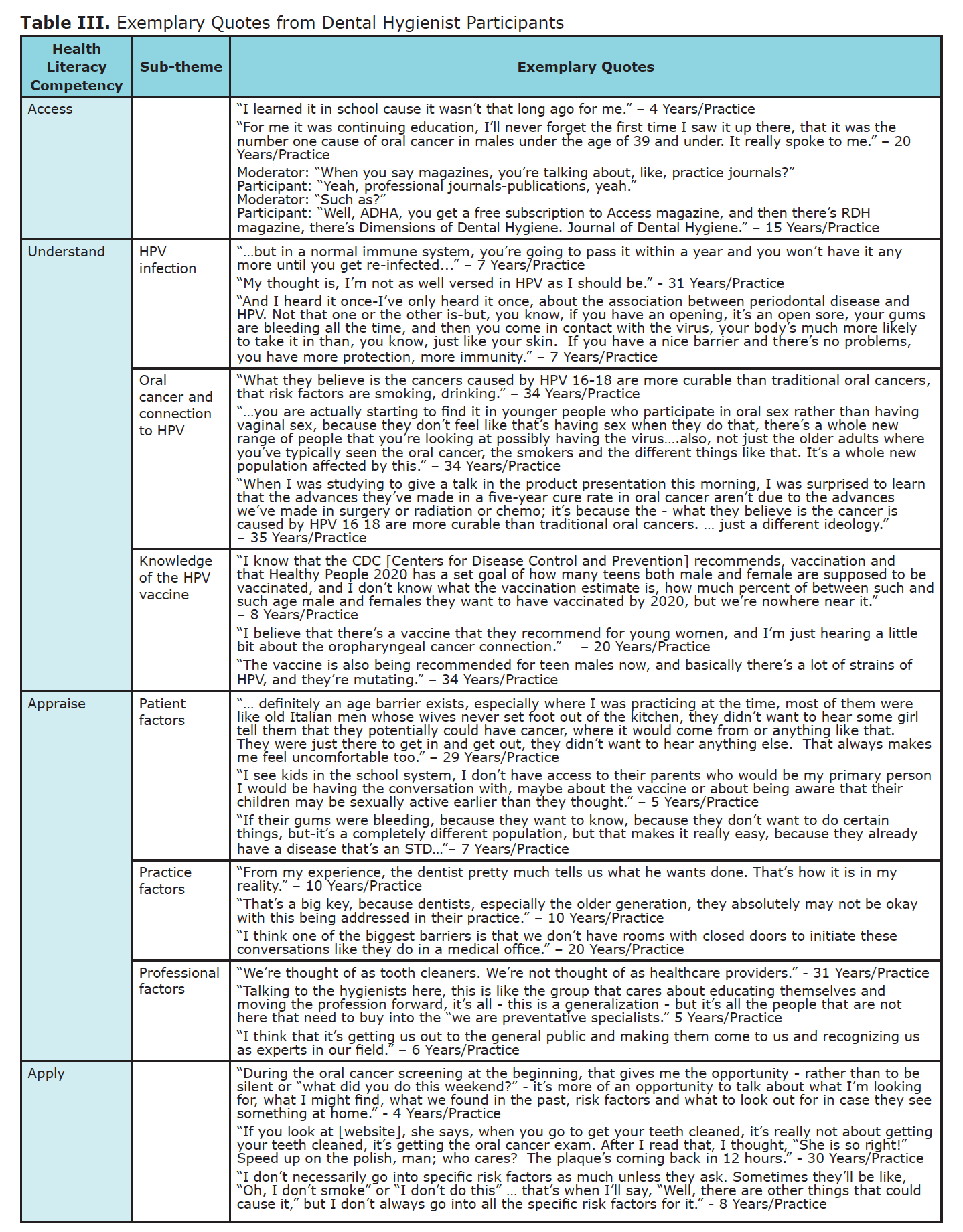 The results from this study present a baseline description of the current health literacy of dental hygienists in relation to HPV. As dental hygienists are among providers who can be both agents and recipients of health literacy, these focus groups helped to better understand the current health literacy process. Overall, dental hygienists reported mixed experiences when accessing, understanding, appraising, and applying information about HPV prevention with their patients.