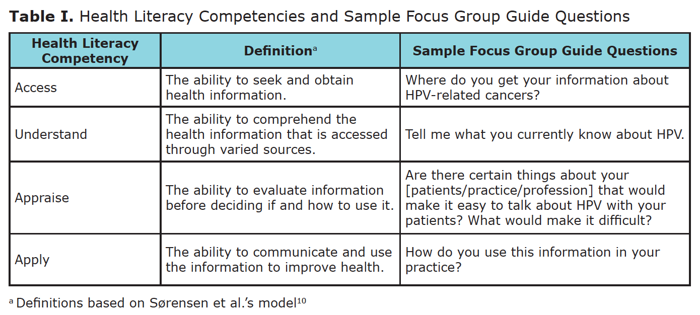 The results from this study present a baseline description of the current health literacy of dental hygienists in relation to HPV. As dental hygienists are among providers who can be both agents and recipients of health literacy, these focus groups helped to better understand the current health literacy process. Overall, dental hygienists reported mixed experiences when accessing, understanding, appraising, and applying information about HPV prevention with their patients.