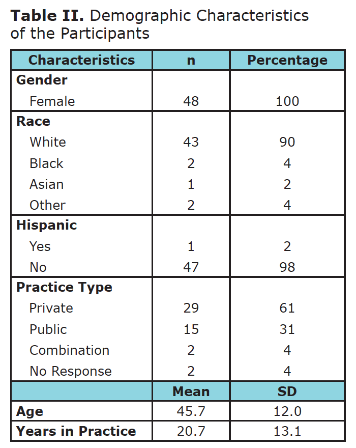 This study sample included dental hygienists licensed in the United States (U.S.) who were recruited via email to take part in focus groups conducted during a national dental hygiene conference in July 2015. Inclusion criteria included the following: (1) possess a current U.S. dental hygiene license; (2) be a graduate of an accredited dental hygiene program; (3) be in practice for more than one year; and, (4) be 21 years of age or older. The University of South Florida Institutional Review Board approved this study.