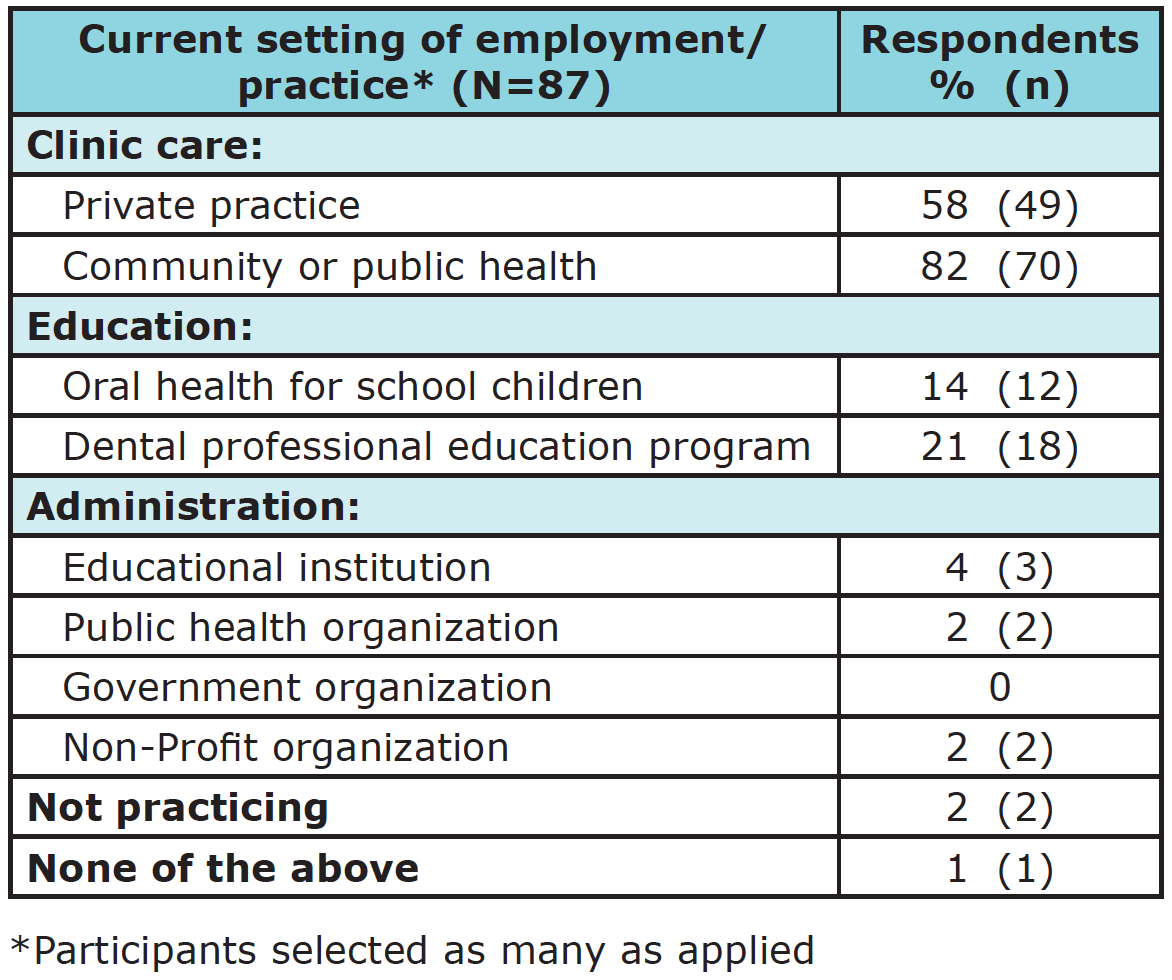 The greatest number of “disagree” responses to the statement “Many patients (or parents of patients) would not accept treatment of dental caries with SDF due to the permanent black staining of the carious lesion” were from respondents who were currently practicing in community or public health settings. This may be because the RDHAPs working in these settings may be regularly treating patients whose primary concern is having teeth free of painful carious lesions. Teeth with black stains due to SDF may not be a contraindication for them.