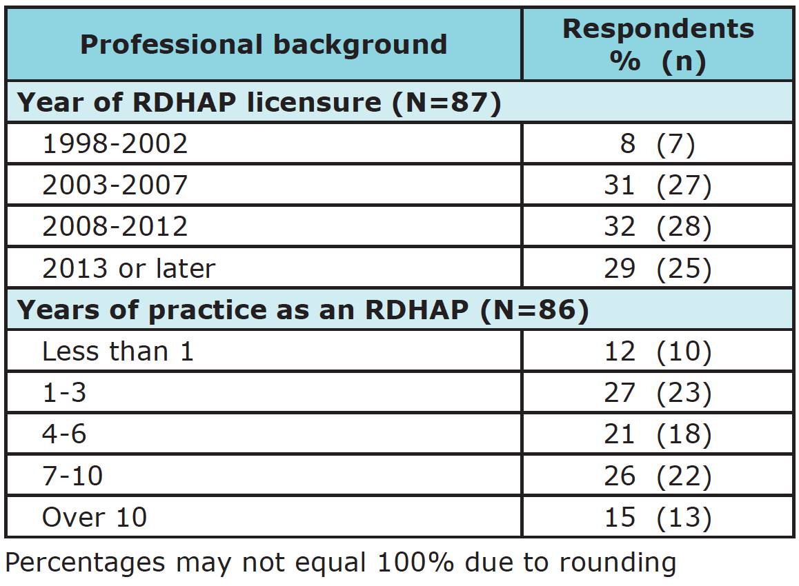 This cross-sectional study was approved by the Institutional Review Board of the University of California, San Francisco (UCSF). The target population consisted of dental hygienists licensed as RDHAPs in the state of California. RDHAP email addresses were acquired from various Internet sources, i.e., publicly available lists available from the Dental Hygiene Committee of California (DHCC), California Dental Hygienists’ Association (CDHA), and LinkedIn. All RDHAPs with known email addresses were included in the invitation to participate in the electronic survey.