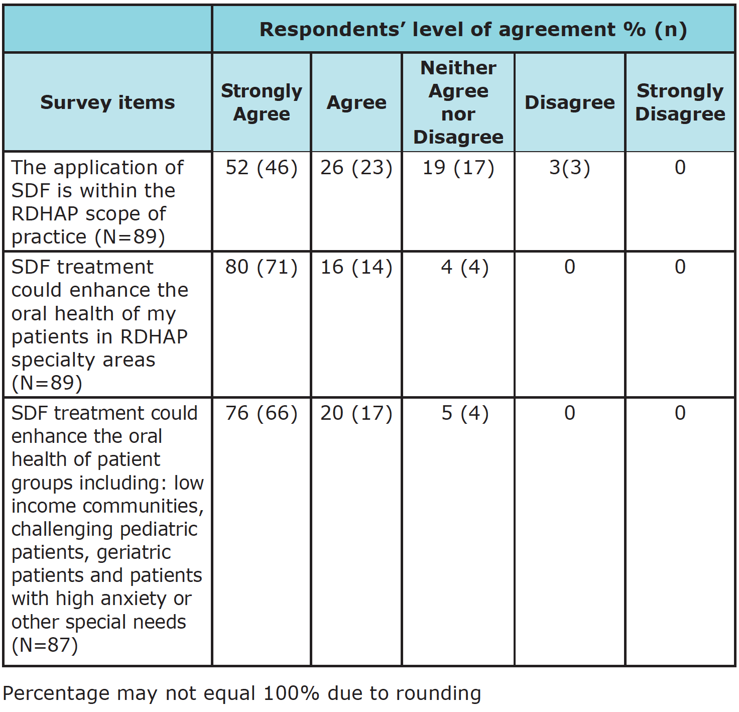A 16-item survey instrument was created to assess the perceptions of RDHAPs regarding treatment of caries with SDF. To assess the respondent’s familiarity with SDF, 8 response options were offered ranging from “never heard of product” to “use product frequently.” A brief description of SDF’s characteristics followed this item, for the benefit of respondents not familiar with SDF: SDF is an inexpensive, non-invasive clear antimicrobial varnish that can be applied with a micro-brush; SDF contains a fluoride concentration of 5%, which is twice the amount of fluoride present in 5% sodium fluoride varnish (2.26%); and the area treated with SDF hardens and turns black. The 12 subsequent questions, regarding the respondents’ perceptions, used the 5-point Likert scale, ranging from strongly agree to strongly disagree. The survey was created and distributed using Qualtrics™ (Provo, UT), a survey research program.