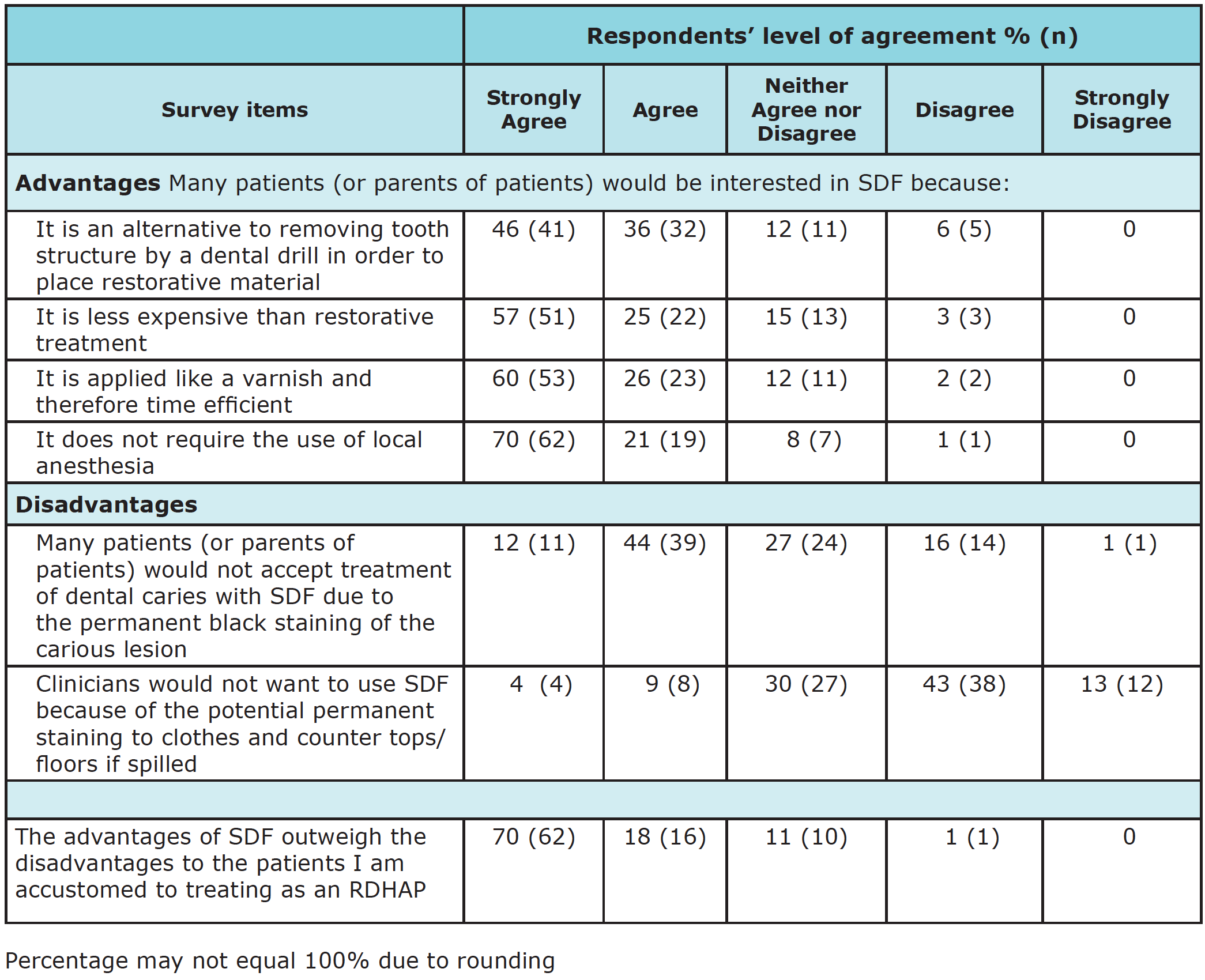The majority of respondents agreed that the advantages of SDF, including its low cost, efficiency of treatment, and the fact that it does not require the use of local anesthesia, outweighed the disadvantage of the black staining for their patient populations. Moreover, the nature of the application procedure facilitates its use by dental auxiliaries, such as RDHAPs.26 Consequently, the respondents in this study would like to use SDF to arrest active carious lesions in their patients and to offer the option of SDF so that their patients can receive optimal dental care.