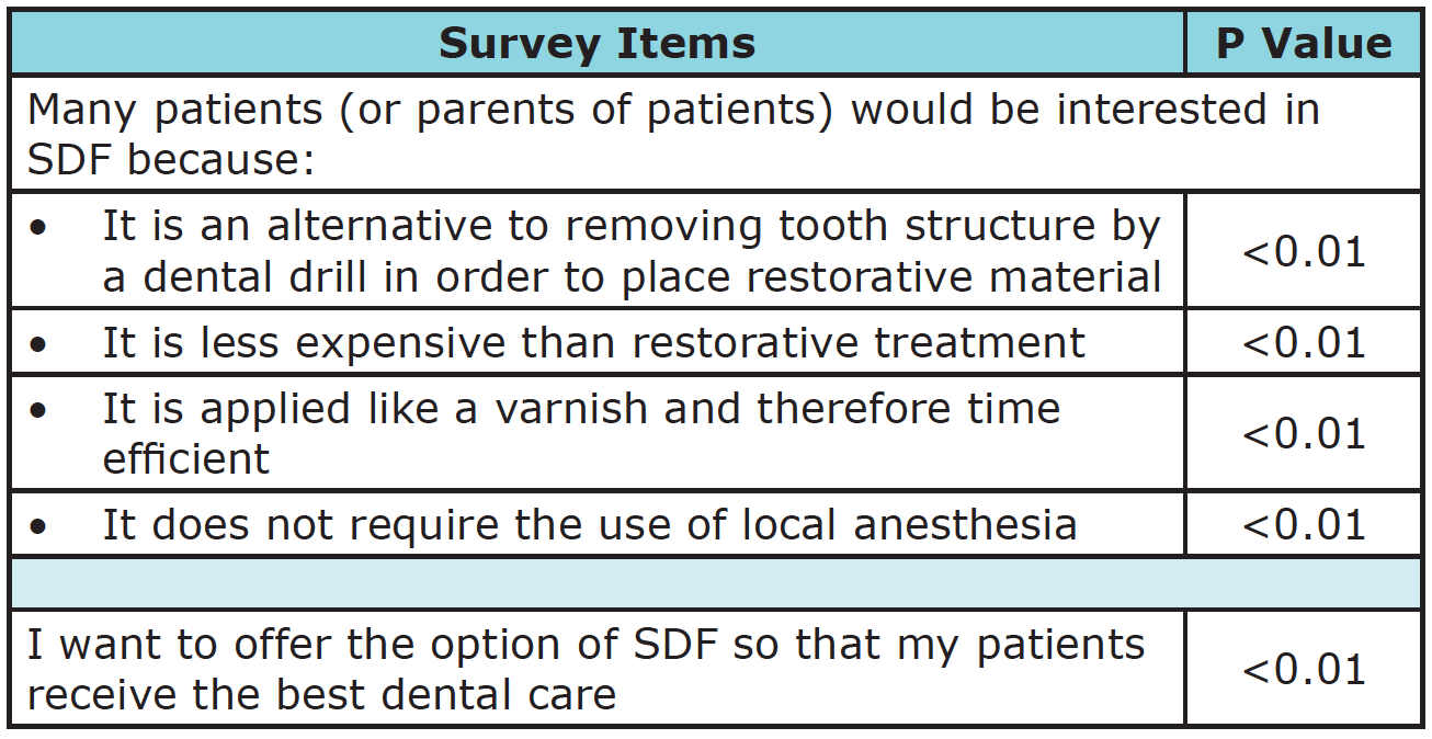 The majority of respondents agreed that patients or their parents would be interested in SDF for a number of reasons. First, it is an alternative to removing tooth structure by drilling to place restorative material. Avoiding dental procedures involving use of a drill could substantially alleviate the angst associated with a dental visit for many patients. Secondly, SDF is applied like a varnish on top of the carious lesion; thus, it does not require the use of local anesthesia. Fear and stress frequently prevent people from visiting the dentist and are attributed to a variety of factors, including the sound of the dentist’s drill and the thought of the needle to administer local anesthesia.30,31 The greatest percentage of respondents strongly agreed that fear of the injection for local anesthesia is a major contributor to dental anxiety. Furthermore, the application procedure of SDF, like that of other topical agents and varnishes, considerably reduces the amount of time required for a dental visit to treat caries.19,20 Lastly, the potential cost of a dental visit can create a barrier for the patient to avoid dental appointments and treatment31; however, in contrast, SDF is very cost effective. Currently sold for approximately $129.00 per bottle (8mL), one drop of SDF (25μL) is sufficient to treat five teeth.1 Therefore SDF may be a viable option for patients faced with the problem of limited financial resources.10,21