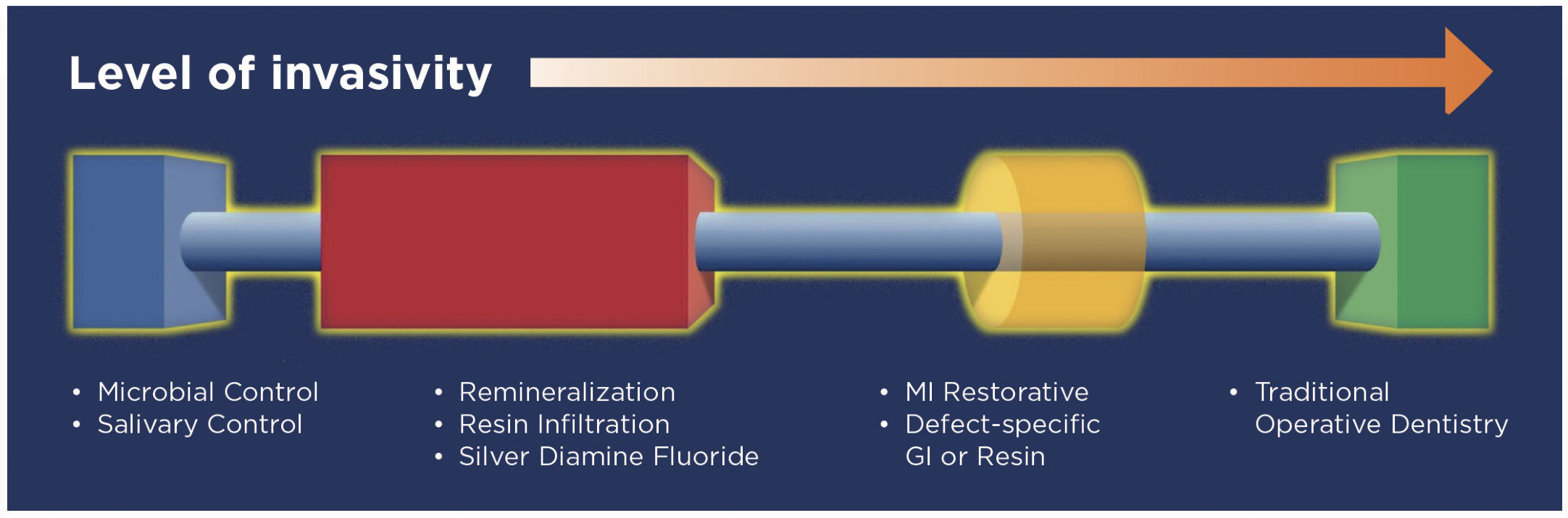 In thinking about the management of dental caries in various phases, one could consider a caries management continuum (Figure 1). In this continuum, the left side reflects the least invasive forms of caries management used prior to the use of surgical restorative interventions. Moving from left to right, interventions progress from salivary and preventive protocols that mitigate risk to minimally invasive restorative dentistry to the latest phases of treatment in the form of traditional operative dentistry. Superimposed on this continuum is the “level of invasivity,” or how aggressive the treatment is in terms of irreversibility. Microbial control, salivary control, remineralization, and resin infiltration are reflective of various treatments one could employ while avoiding surgical intervention. Given the ever-increasing availability of early caries detection tools, and more specific caries risk assessment tools, it will become increasingly possible to deploy nonsurgical approaches in the form of medicinal therapeutic interventions and avoid surgical restorative intervention.
