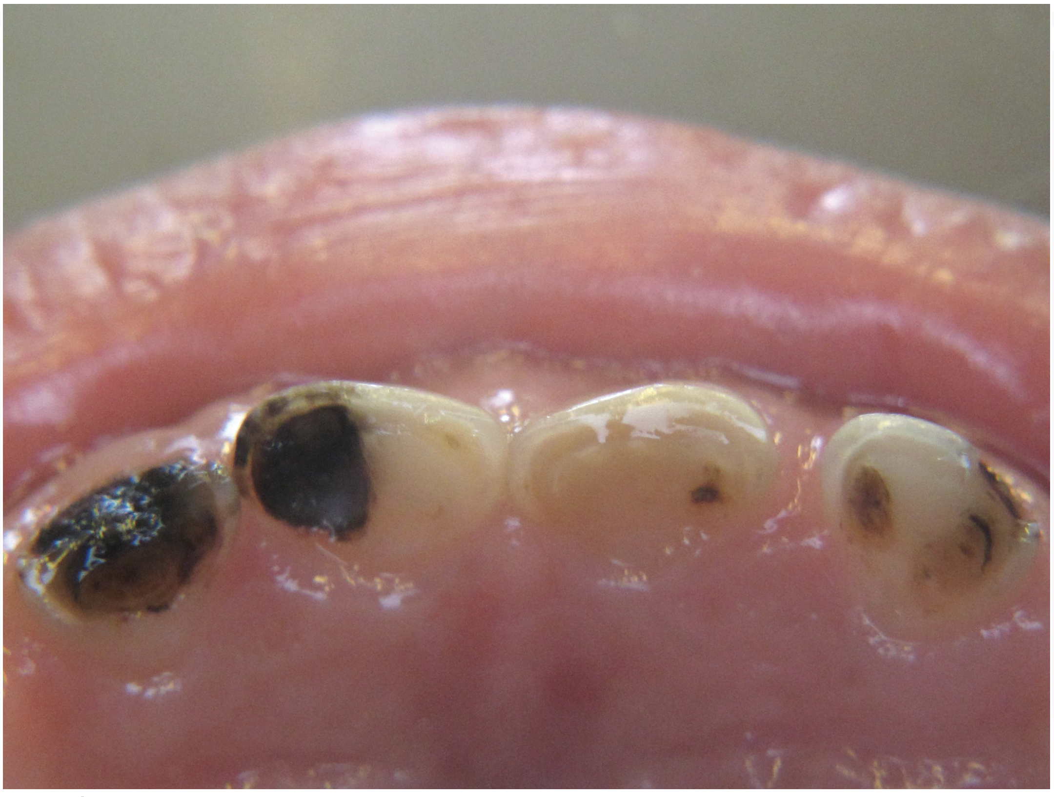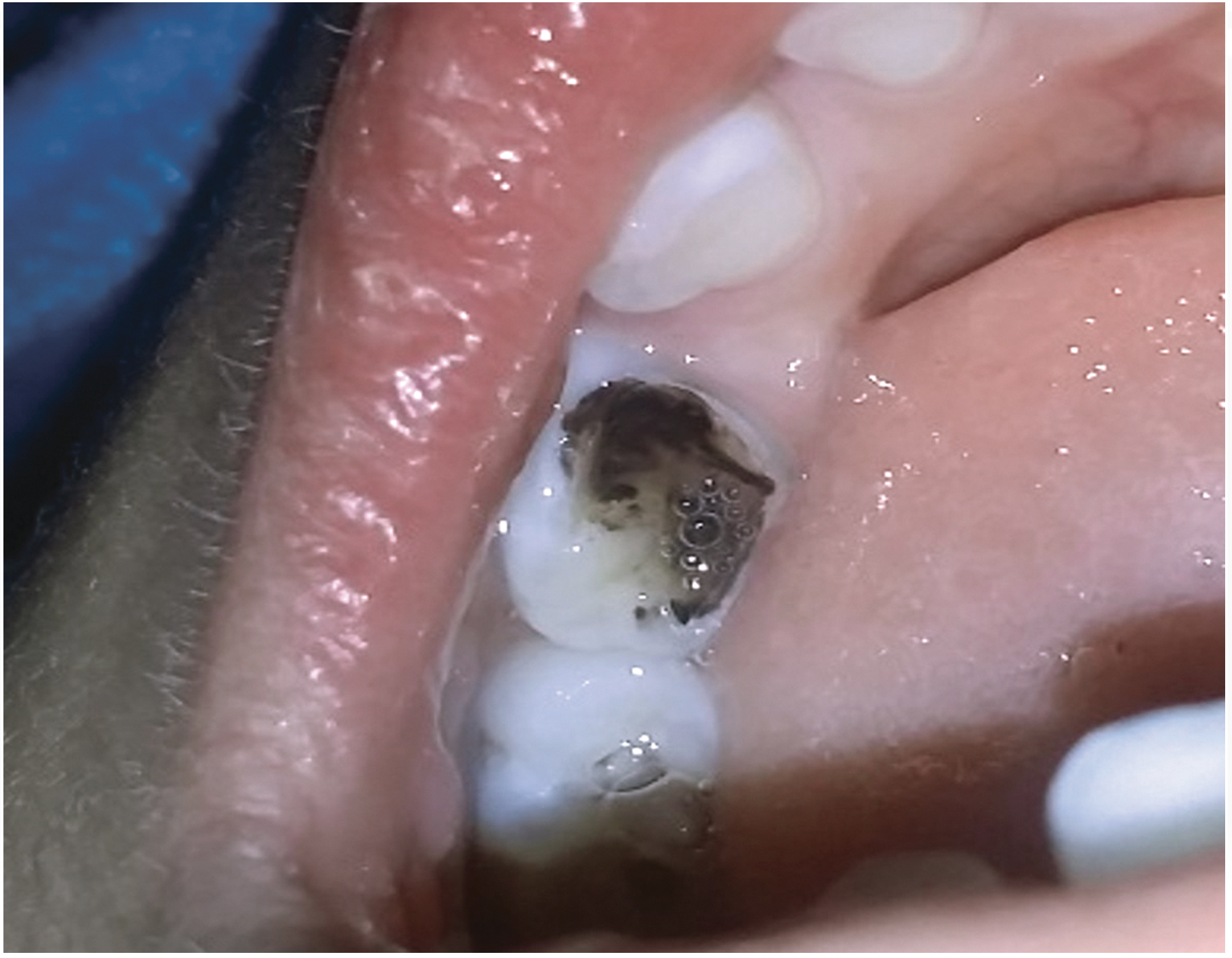 The available SDF product is a clear liquid that is carefully applied in small quantities to the accessible caries lesion. After 30 to 60 seconds of application, the lesion turns black in color, and as reported by each clinician who uses the product, there exists a colorometric indication of biofilm disruption/destruction32,33 (Figure 2). When the patient returns for follow-up after placement of the SDF treatment, it can be explained that the black color indicates biofilm destruction within the lesion and halting of progression of the lesion (Figure 3 and Figure 4). The surface of the dentin below the previously softened caries-affected dentin can be hardened and no longer affected by the biofilm. In some cases, lesions adjacent to the caries lesion intended to be treated can be halted in their earlier stages of development, such as with adjacent proximal lesions (Figure 5).