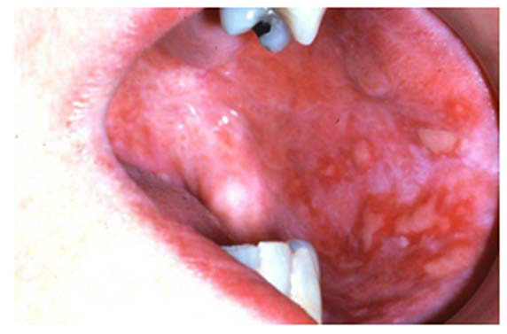 Antibacterial and corticosteroid therapy is often complicated by superinfection with candidal organisms in oral tissues.14,16 Antibacterial agents kill bacteria allowing candidal species to successfully compete for nutrients. Corticosteroids promote gluconeogenesis and a hyperglycemic state facilitates the growth of the opportunistic candida species. Candidiasis may appear as white, raised, cottage cheese-like, or pseudomembranous lesions that can be scraped off, leaving a red and sometimes hemorrhagic base.