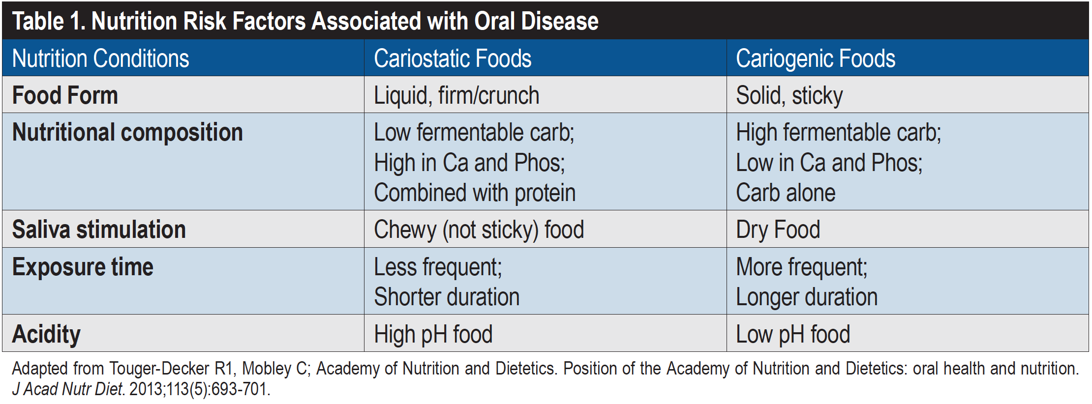 Several dietary factors are associated with oral disease and periodontal health (Table 1).12 For example, acidic foods can cause dental erosion, while fermentable carbohydrates that feed the microorganisms in the mouth cause dental caries.16 Firmer foods that do not adhere to teeth are better for dental health than food that is sticky. Eating foods or chewing gum to promote saliva stimulation can help improve oral health. Finally, food exposure time plays a part: frequency will increase exposure time.