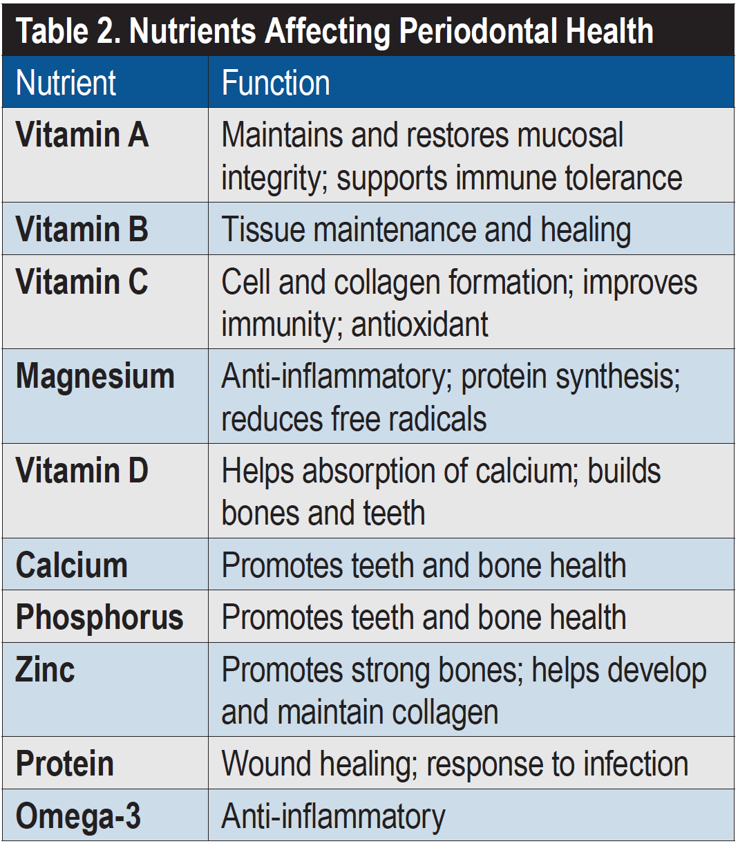 In addition, the nutritional composition of food is important for oral health: many vitamins and minerals are essential12 (Table 2). Overall, these nutrients promote the restoration of bone structures and healthier cell formation.