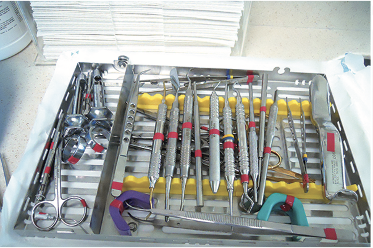 Instrument cassettes were first introduced in hospitals to organize instruments into procedure sets. They were later incorporated into dental school clinics, and in recent years have also become increasingly popular in dental offices. One important feature of instrument cassettes is that a single cassette can be used to hold and organize a complete set of instruments for a specific procedure (Figure 1). This convenience eliminates the need to gather multiple packages for a procedure. In addition, cassettes allow for less handling of contaminated instruments during cleanup and reprocessing. This latter attribute can provide additional safety by enhancing instrument flow while saving time. Table 1 summarizes the main advantages of using a cassette system in dental practice. Figure 2 shows an instrument cassette ready for chairside use.