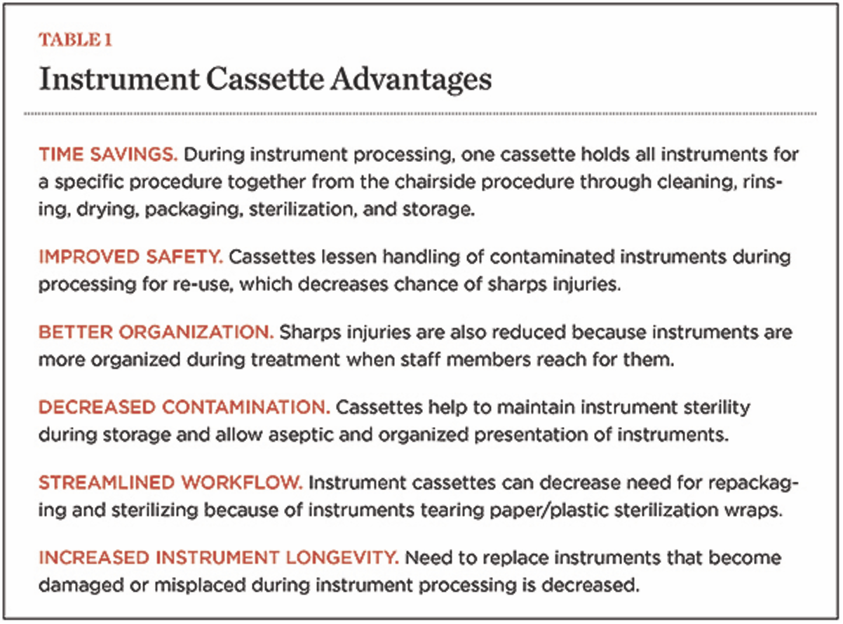 One aspect to consider when implementing an infection control program is selecting technologies and products that can maximize a safe and efficient work environment for healthcare personnel and patients. Instrument cassettes represent examples of both a technology and a product that can be integrated into a dental office. When used appropriately, cassettes can increase organization and improve safety and infection control both in the dental operatory and when processing instruments for reuse on patients.