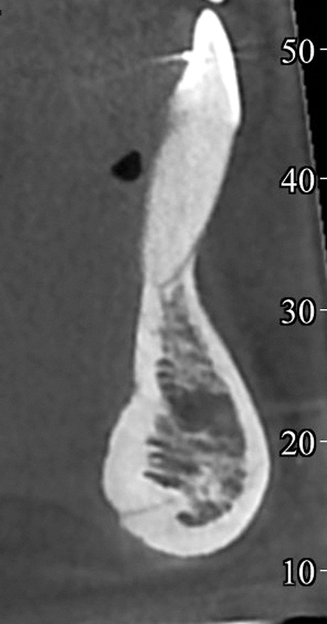 In cases with thin lingual bone, as measured on CBCT (<2.5 mm at a level of 8 mm apical to the CEJ), orthodontic treatment is not advisable, leaving surgical root coverage as the only option. However, the prognosis for this procedure is poorer, because the predominant cause is not addressed. Figure 4 shows the frontal clinical view of a patient with a hyperdivergent growth pattern who presented with post-orthodontic GR of a labially displaced lower central incisor. The sagittal CBCT view (Figure 5) shows complete absence of lingual bone, which contraindicated orthodontic tooth repositioning.