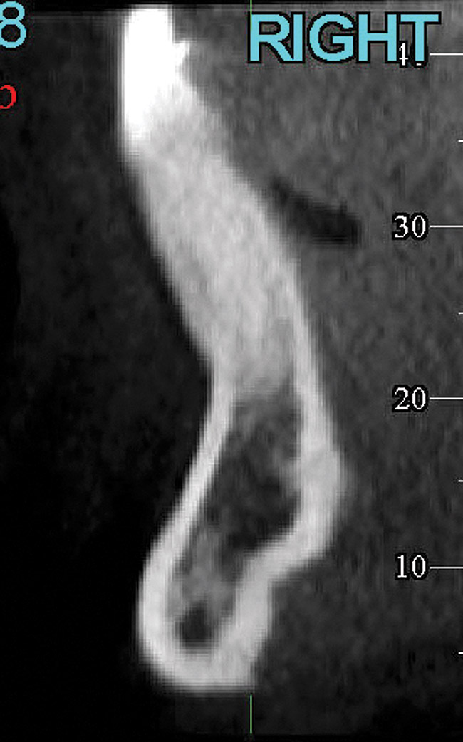 It is noteworthy that the facial growth pattern has an influence on the morphology and thickness of the labial and lingual bone plates; patients with a vertical growth pattern (hyperdivergent) exhibit a thinner mandibular symphysis and a thinner alveolar ridge in the anterior region of the mandible compared with patients who have horizontal growth (hypodivergent) or a normal growth pattern.36,37 Therefore, the clinician should be aware that the chances of finding adequate thickness of lingual bone for root repositioning in a long-faced hyperdivergent patient are significantly smaller.