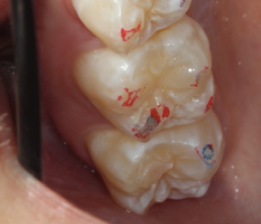 After centric relation is found, the point of first contact must be determined. The point of first contact may be a keystone tooth, but not everyone has a keystone tooth. The point of first contact needs to be marked, but not necessarily physically. In Figure 1, showing teeth Nos. 2 and 3, the point of first contact is on the mesiolingual cusp of No. 2, which has the strongest blue mark. There is also a slight mark on the distal buccal cusp of tooth No. 3. When the jaw is in centric relation, the point or coincident points of first contact are called centric occlusion. Centric relation is a joint position and is found independent of tooth contact; the joint is centered and teeth do not need to touch if centric relation is in the joint space. When the opposing teeth come together in the joint space, the term is centric occlusion.1