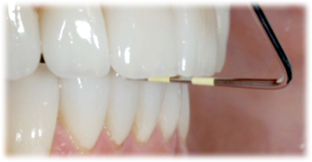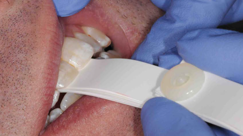 MIP is the term for the habitual bite, when the patient squeezes together and the maximum number of teeth touch. Centric occlusion can be determined with bilateral manipulation, bilateral guidance (Figure 2), or a leaf gauge (Figure 3).6 The position may or may not coincide with MIP.7,8 If the dentist is planning to restore the tooth that has the point of first contact, the existence or absence of a slide must be determined. The author's preferred technique to identify the slide is by having the patient squeeze the teeth together in MIP to determine whether the jaw shifts in any substantial way when going into that position.