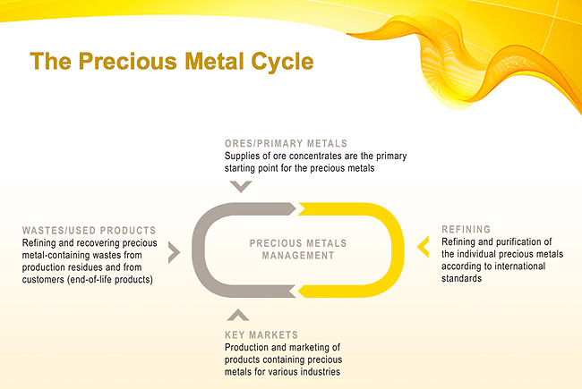 Fig 1. The precious metal cycle. Refined metals may be used again for other materials and markets.