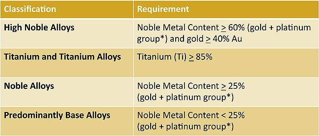 10. ADA Revised classification system for alloys for fixed prosthodontics. American Dental Association Web site. http://www.ada.org/2190.aspx. Published March 2003. Accessed April 26, 2013