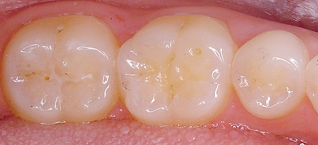Deciding which teeth are at risk will vary from clinician to clinician and be based upon experience. A possible criterion that may be used is the determination of whether the tooth has deep occlusal pits and fissures. Some concern has been raised with regard to sealing over undiagnosed, incipient carious lesions on the occlusal surface. Research has shown that sealing active caries in pits and fissures from clinical and radiographic findings that there is no progression of the carious lesions.17-19 Therefore, based upon the evidence to date, placing sealants on at-risk teeth is a cost-effective technique while sealant placement over active or incipient carious lesions does not appear to be detrimental.