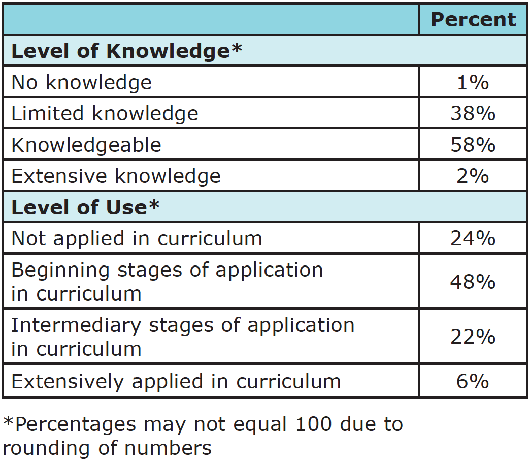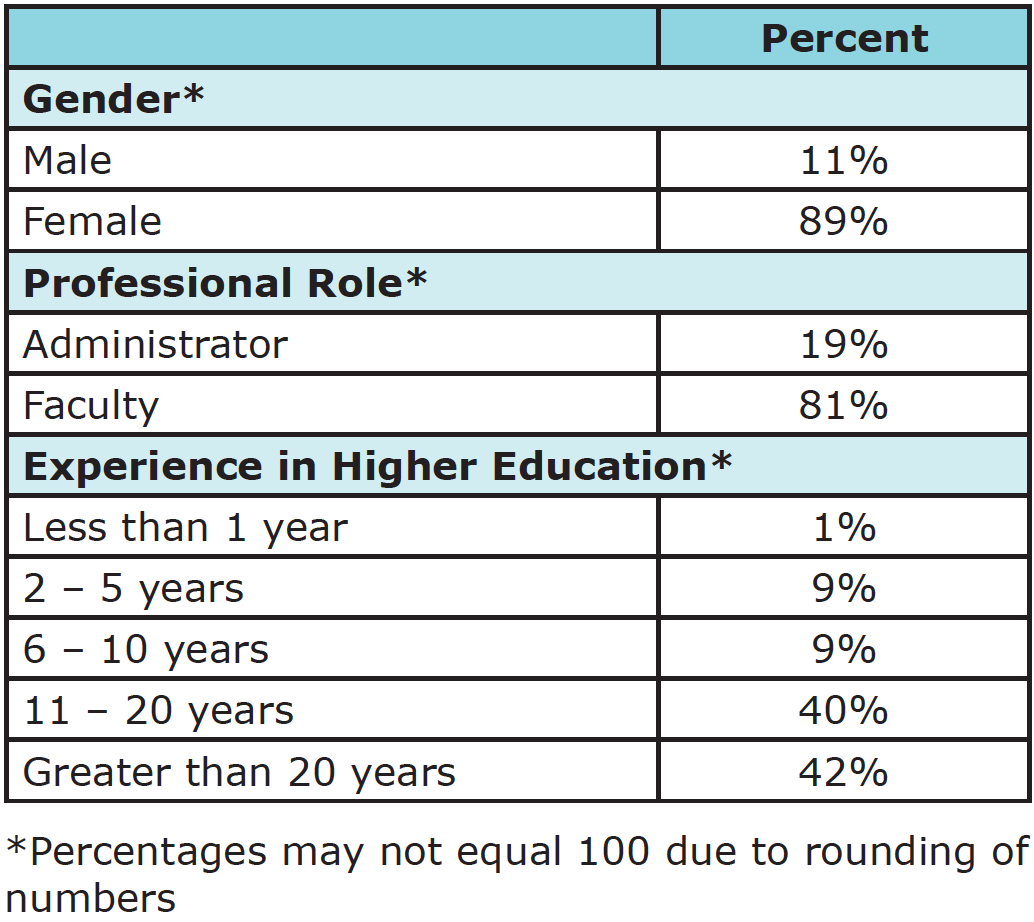 Demographic information about survey respondents was collected and shown in Table I. Most of the respondents reported that they were females in the role of a faculty member. Their experience in higher education was similarly distributed in intervals ranging from two to 10 years and from 11 to more than 20 years, respectively.