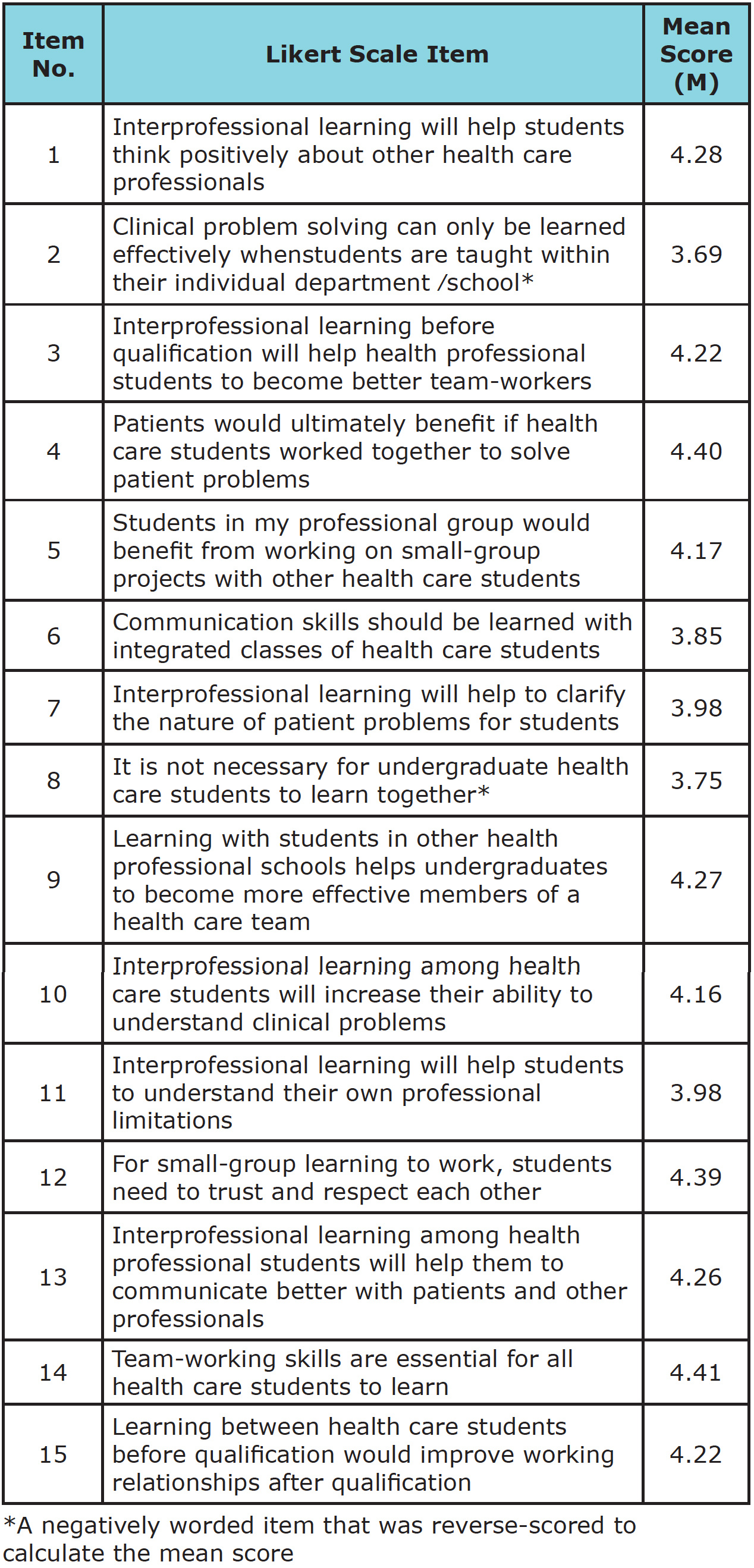 Likert scale items and the mean scores of the 15 statements for Attitudes towards Interprofessional Education are exhibited in Table II. Similarly, Table III presents the 13 Likert scale items and associated mean ratings for Attitudes towards Interprofessional Learning in the Academic Setting. Mean calculations were used to determine the perspectives towards each statement. Separate measurements of each item was key to the assessment of the individual attitudes towards the multiple components of IPE thus revealing elements that were favored and identifying areas that were not held in the same regard. Scores closer to 5.00 indicated positivity, whereas those closer to 1.00 indicated negativity. Reversed scored items, shown on Tables II and III, were appropriately calculated.