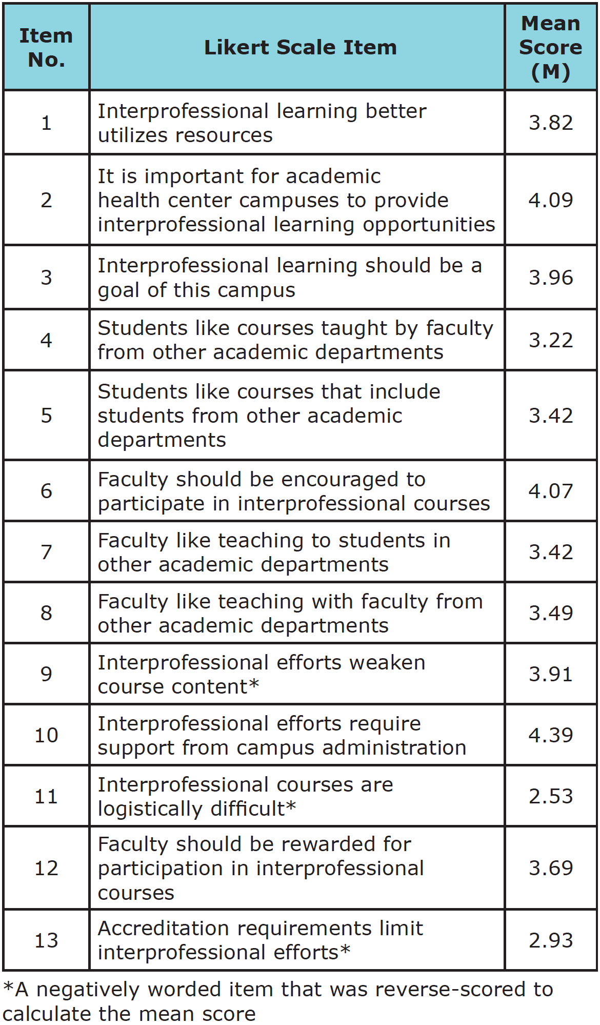 Administrators and faculty believed that IPE should be a goal of their campus (M = 3.96). This viewpoint can be clarified through agreement expressed with the following statements: "students like courses that include students from other academic departments" (M = 3.42), "faculty like teaching to students in other academic departments" (M = 3.42), and "faculty like teaching with faculty from other academic departments" (M = 3.49). Respondents felt that in order for interprofessional efforts to be successful, support from administration is requisite (M = 4.39). They agreed that health science campuses should encourage faculty to become involved in teaching multidisciplinary courses (M = 4.07), which could satisfy the notion that institutions should offer their students shared learning experiences (M = 4.09).