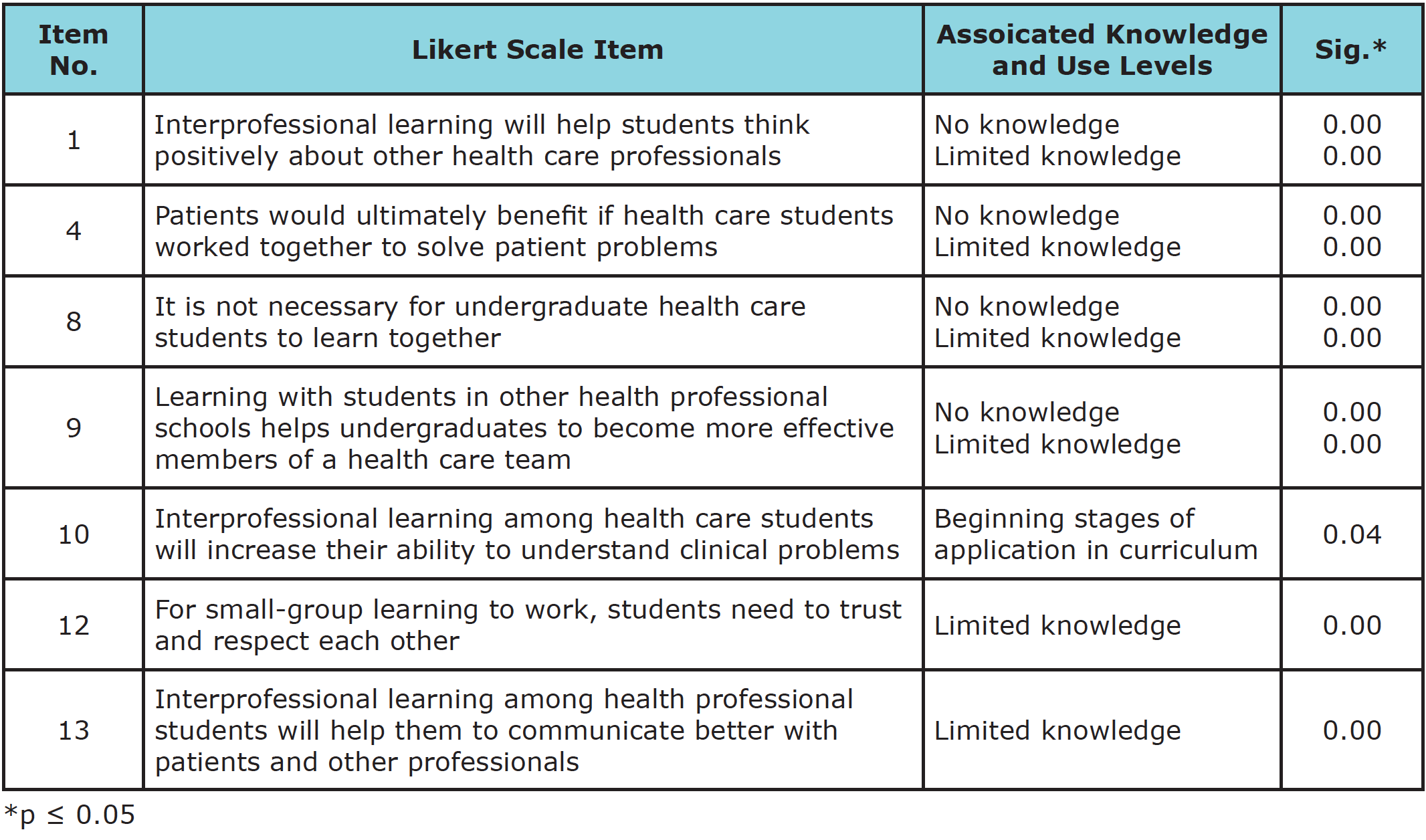 Ordinal regression analyses were calculated for each Likert scale item (Tables II and III) and for each level of the variables knowledge and use (Table V), further exploring the relationships identified by the Spearman's rho correlation coefficient. Statistically significant associations (p≤0.05) were noted, detailing the connection between respondents' attitudes towards IPE and their understanding as well as its use. (Table VI and Table VII)