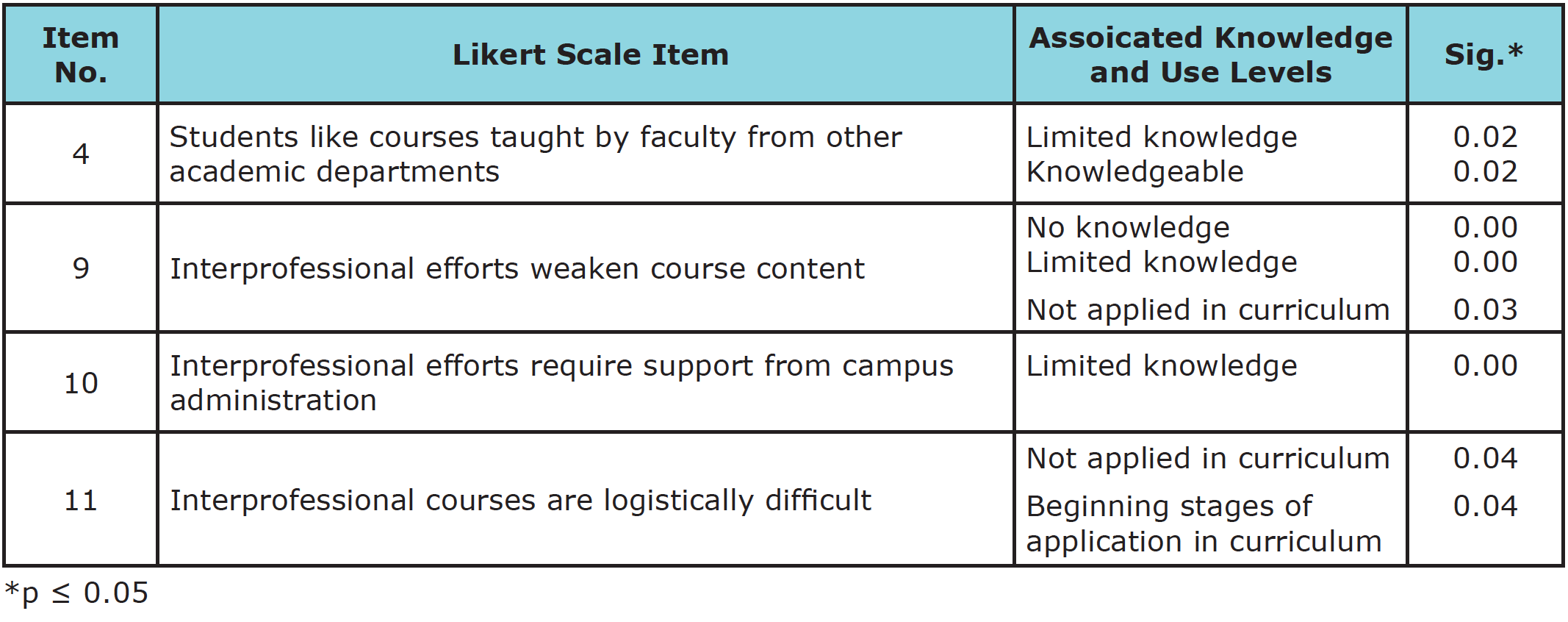 Significant relationships between attitudes and knowledge about IPE were demonstrated. (Tables VI and VII) The 1% of survey respondents with no knowledge (p=0.00) of IPE in addition to the 38% with limited knowledge (p=0.00) of it, felt that multidisciplinary learning would bring about positive feelings towards other health care professionals. Additionally, those with no knowledge (p=0.00) and minimal comprehension (p=0.00) of inter-professional practices, felt that patients would benefit from a collaborative care approach. This same 1% (p=0.00) and 38% (p=0.00) of the population believed that IPE is a necessity for health science programs. Respondents reporting no (p=0.00) or little familiarity (p=0.00) with collaborative education, still strongly agreed that exposure to IPE during training, produces competent members of integrated medical groups. Even with limited understanding (p=0.00) of interprofessional concepts, administrators and faculty strongly believed that team-based learning is only effective in the presence of mutual trust and respect. Little acquaintance (p=0.00) with IPE was still sufficient for recognizing how it enhances communication skills. Respondents with different knowledge levels, varying from limited (p=0.02) to well informed (p=0.02), expressed more agreement with the concept that students would enjoy working with faculty from departments other than their own. Responders citing no awareness (p=0.00) of, or having minimal insight (p=0.00) into interprofessional practices, believed that IPE does not diminish course material. Thirty-eight percent of the population reporting some knowledge (p=0.00) of IPE, felt that institutional support is necessary in order for joint efforts to be successful.