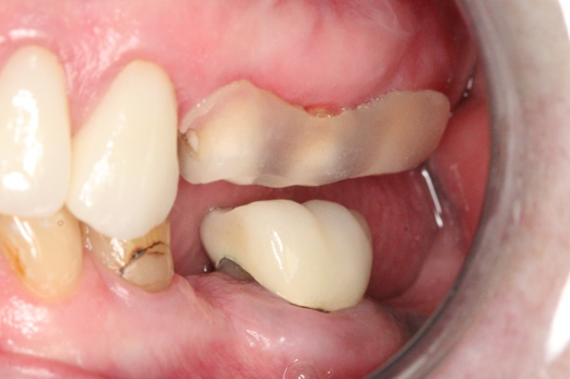 Figure 1 and Figure 2 depict the preoperative image and subsequent removal of three posterior teeth, immediate placement of zirconia-oxide ceramic dental implants, and soft-tissue augmentation with platelet-rich fibrin (PRF) to enhance the soft-tissue architecture surrounding the ceramic implants. The teeth were removed atraumatically and without suture placement. Because the implants were one-piece in stature (the abutment was incorporated into the implant), the recommendation was to splint the multiple units to minimize the lateral forces from mastication, swallowing, and tongue movement.