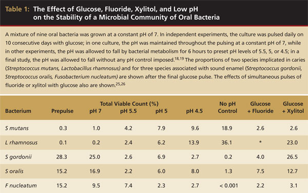 - Inhibition of plaque acid production, eg, by fluoride-containing products or other metabolic inhibitors such as xylitol. Fluoride not only improves enamel chemistry but also inhibits several key enzymes, especially those involved in glycolysis and in maintaining intracellular pH.24 Fluoride and xylitol can reduce the pH fall following sugar metabolism, and in so doing, prevent the establishment of conditions that favor growth of acid-tolerating cariogenic species25,26 (Table 1). Xylitol can interfere with sugar transport in mutans streptococci, and therefore cannot be metabolized to acid nor generate a low pH in plaque.