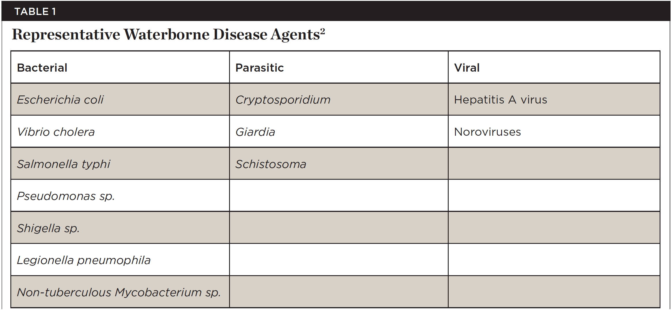 The association between waterborne microorganisms and human disease caused by contamination of water sources has been documented since the mid-1850s.1 Since then, a wide variety of both microscopic and macroscopic forms have been shown to survive and proliferate in both natural water and manmade environmental systems (Table 1).2 Although established public health water-treatment regulations (ie, filtration and chlorination) have been in effect for many years, waterborne infection and disease outbreaks continue to be reported from drinking water, recreational water, hospital water, and water from healthcare-related devices. Extensive documentation of these types of infections can be found in medical literature.3-8 Until recently, outbreaks and severe infections from contaminated water in healthcare settings were primarily reported in hospitals.