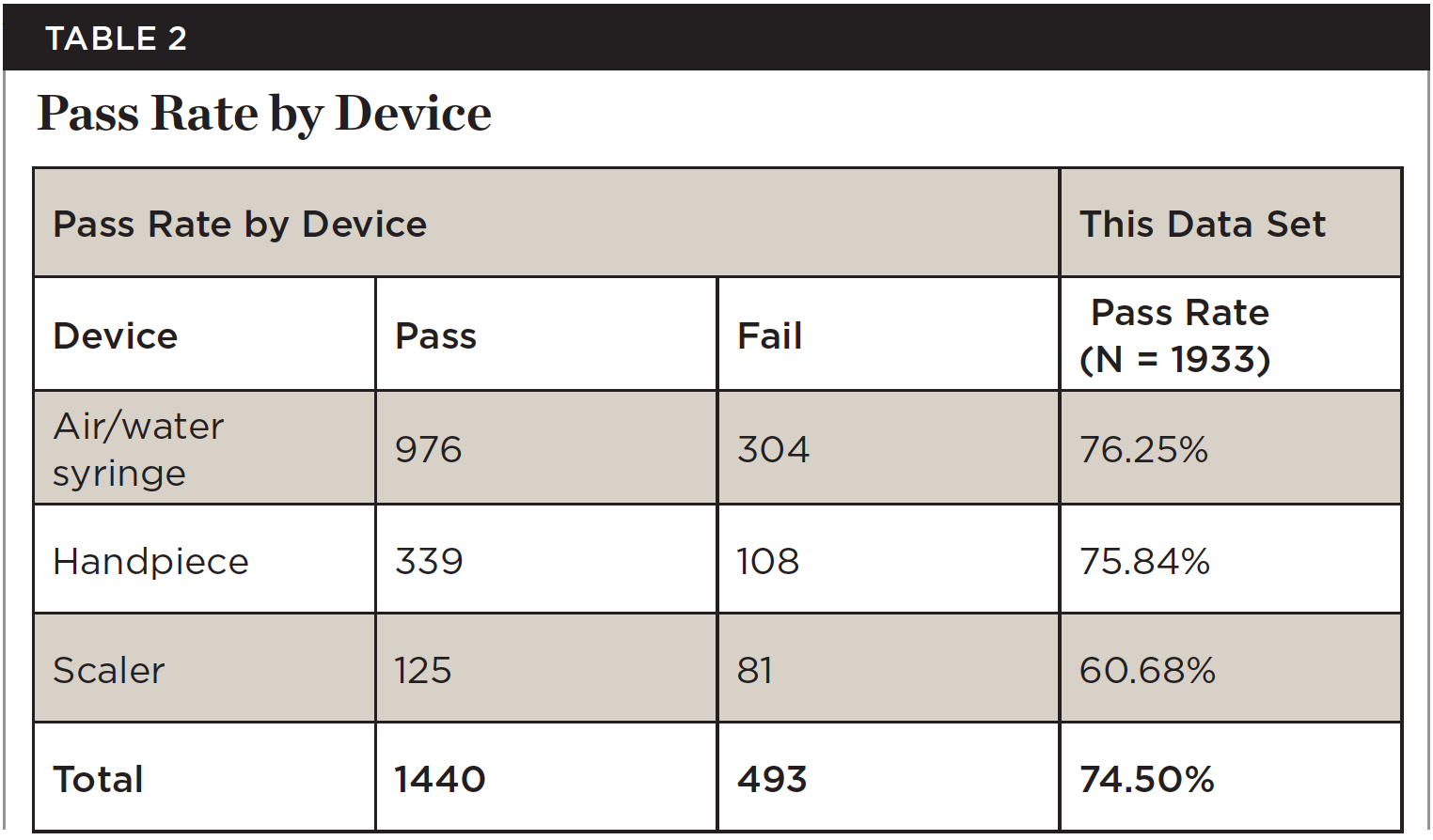 One analysis compared test results from samples taken at different devices or lines. The results showed that 76.25% of air/water syringe hoses passed and 75.84% of the handpiece hoses passed, but only 60.68% of scaler hoses passed. Average pass rate for all types of lines was 74.5% (Table 2).