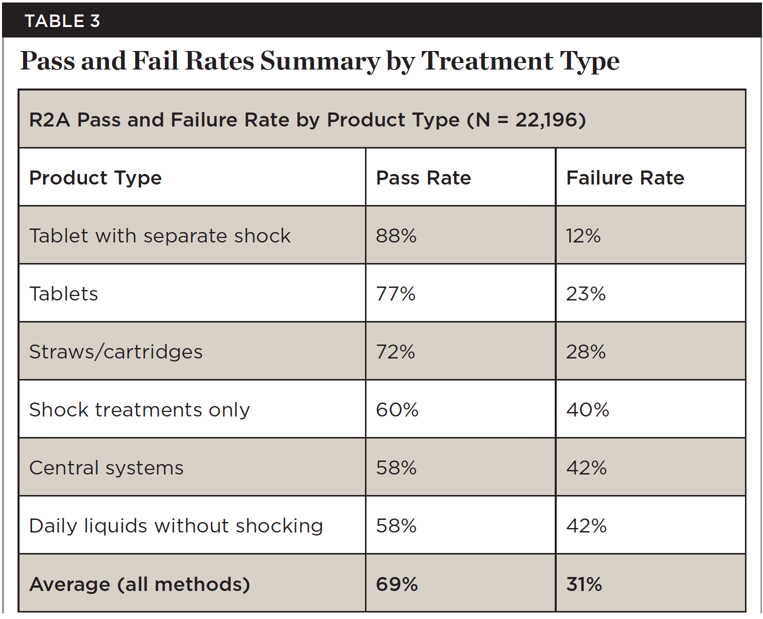 In addition to the testing for different types of water lines, various treatment protocols were compared. Table 3 represents field data accumulated from hundreds of dental facilities. The data reflect the potential misuse of the individual products. Failed water tests are typically corrected after identifying mistakes such as not following manufacturer instructions and not shocking on a regular basis.
