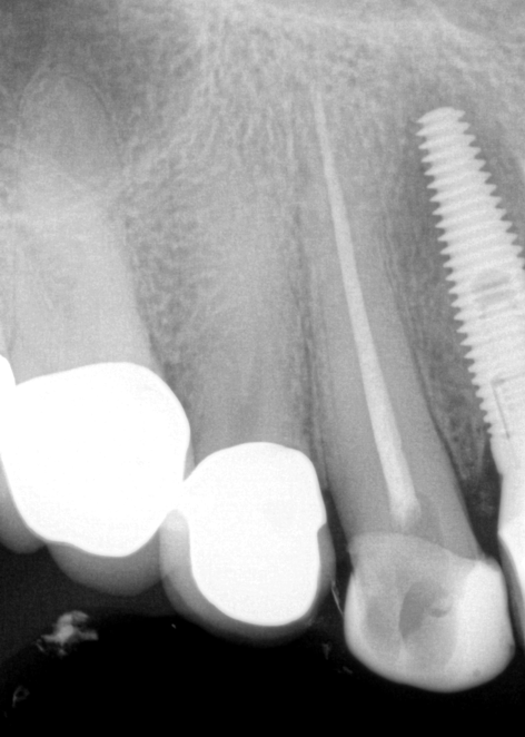 The patient returned for final evaluation of the provisional calcium-hydroxide endodontic therapy and resolution of the infection (33 days postoperatively). Fistula was not present; the tooth was not sensitive to percussion or mastication. The gold crown was removed using a high-speed metal cutting bur, the remaining caries were excavated conservatively, and the endodontic therapy was completed. Placement of glass-fiber reinforced composite and composite core buildup took place. The natural tooth structure to receive the glass-fiber post and a long-term restoration was available (Figure 8). Within one appointment, the tooth was restored (Figure 9). The patient was instructed to return for clinical and radiographic evaluation after 6 to 12 months to determine progression of periodontal healing. At that time, if the healing were adequate and the tooth were stable, evaluation of the tooth would be considered every 3 to 4 years.7